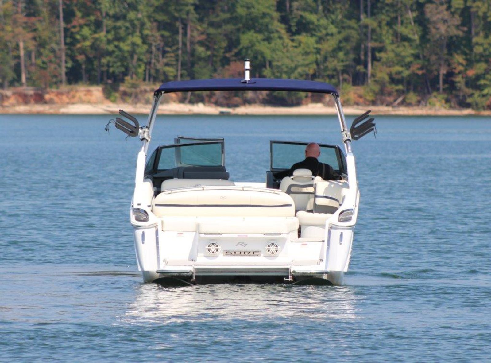 Enjoy your favorite tunes on the upgraded Premium Sound System, complete with transom speakers and remote, all powered by dual Garmin screens for full navigation and surf control.