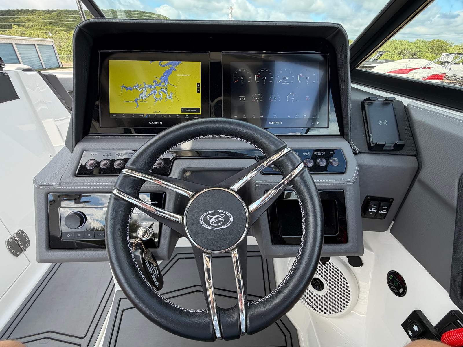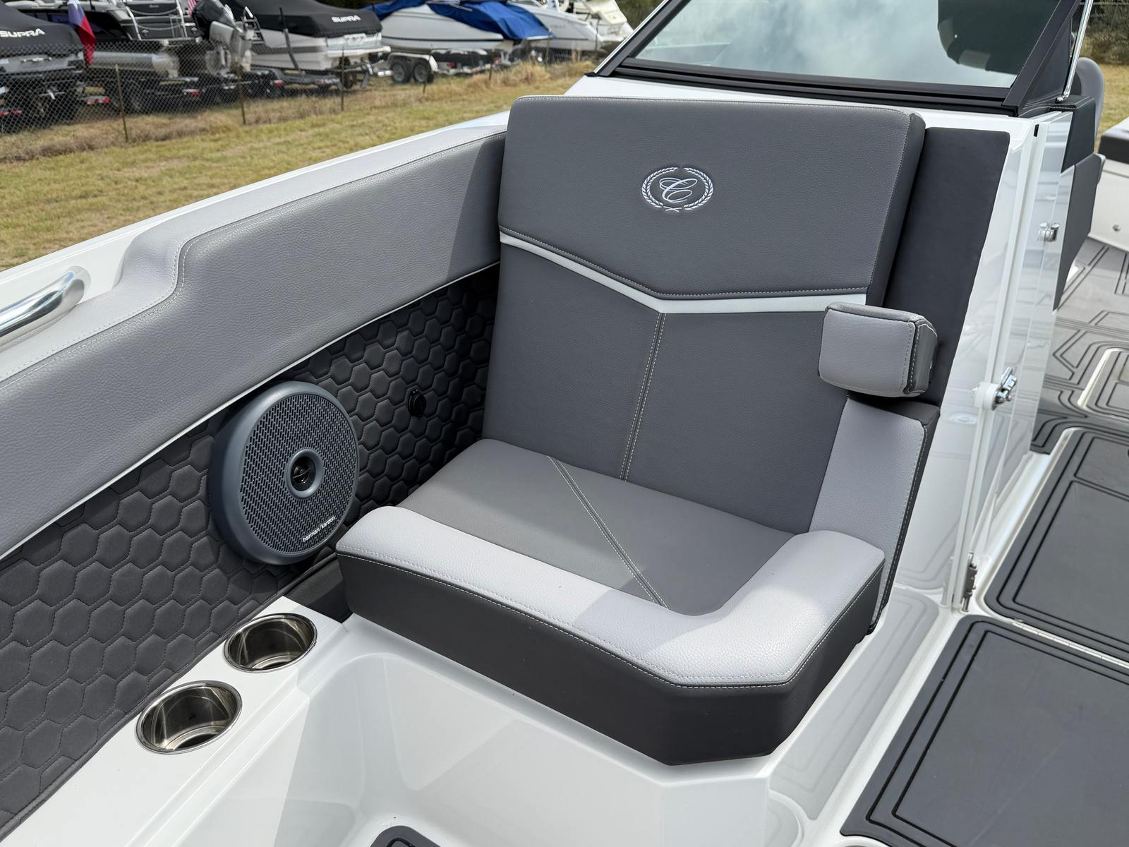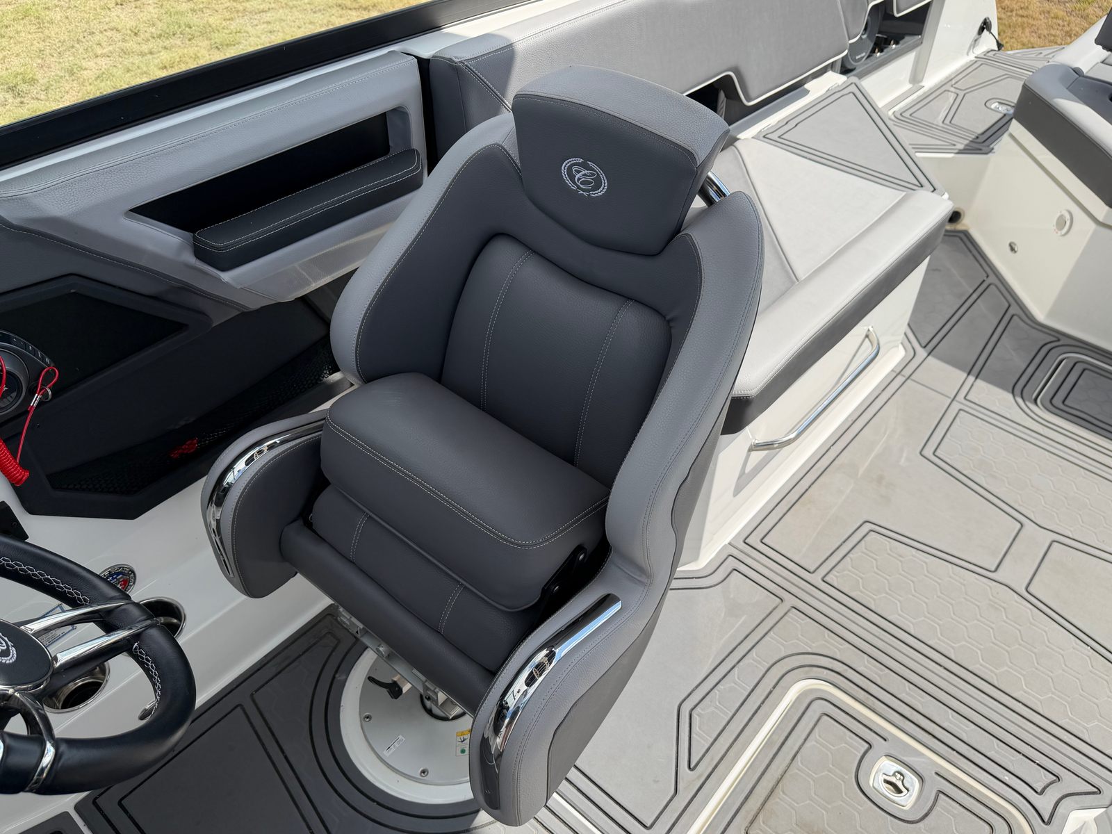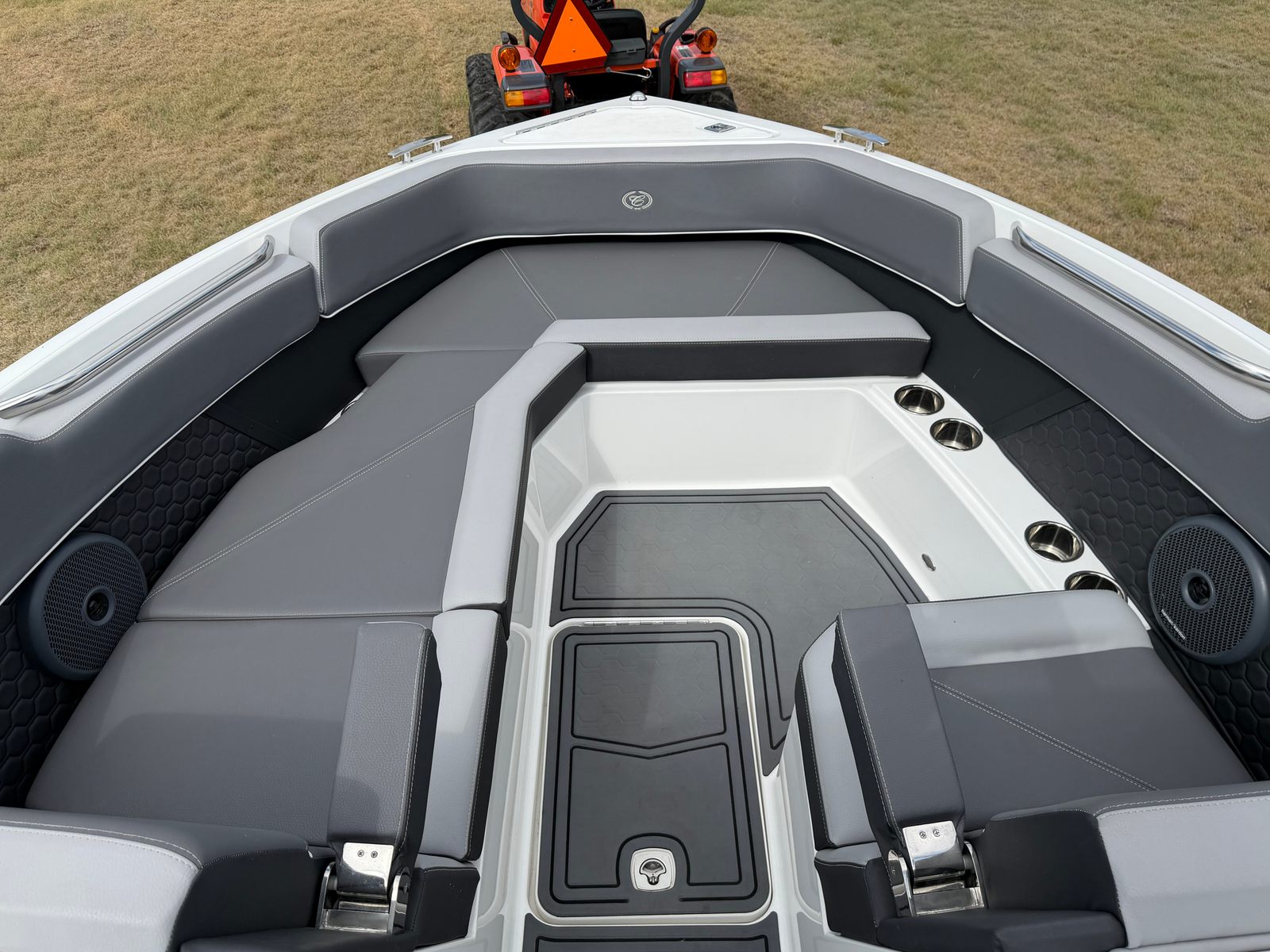 The Cobalt R8 Surf is packed with features that enhance both its functionality and enjoyment. As a bowrider, it offers an open and inviting layout, perfect for socializing and soaking up the sun. The spacious bow seating area provides a comfortable spot for passengers to relax, while the cockpit is designed for both convenience and luxury. High-quality materials and attention to detail are evident throughout, reflecting Cobalt’s commitment to craftsmanship and durability.This model’s surf capabilities set it apart from other bowriders. The R8 Surf is engineered for water sports enthusiasts, offering a smooth and customizable wake for surfing, wakeboarding, and more. The intuitive controls make it easy to adjust the wake to suit different skill levels, ensuring everyone can have a great time on the water. The boat’s length of just over 27 feet provides ample space for gear, coolers, and all the essentials needed for a day of fun.