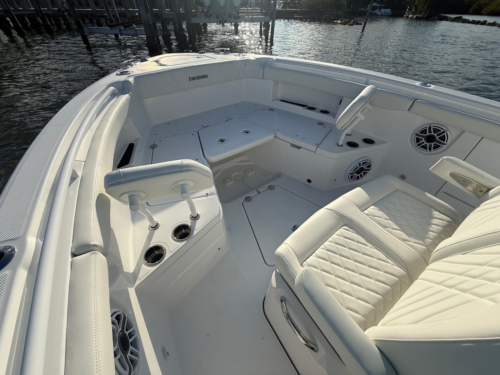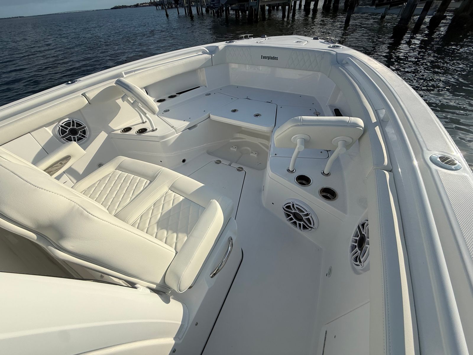 The Everglades 285 CC is loaded with premium features designed to elevate your boating experience. The Premium Audio Package transforms every outing into a private concert, delivering crystal-clear sound whether you’re anchored at your favorite sandbar or cruising along the coastline. Underwater Lights and Spectrum Quattro RGBW lighting create a captivating ambiance for evening adventures, illuminating the water and setting the perfect mood for entertaining guests.Practicality meets innovation with the ladder for side access reboarding door, complete with dedicated storage, ensuring safe and convenient entry and exit from the water. The Elite Package and Canvas Package add layers of comfort and protection, making every trip enjoyable regardless of the weather. The boat’s thoughtful design extends to storage solutions and layout, providing ample space for gear, refreshments, and personal items.