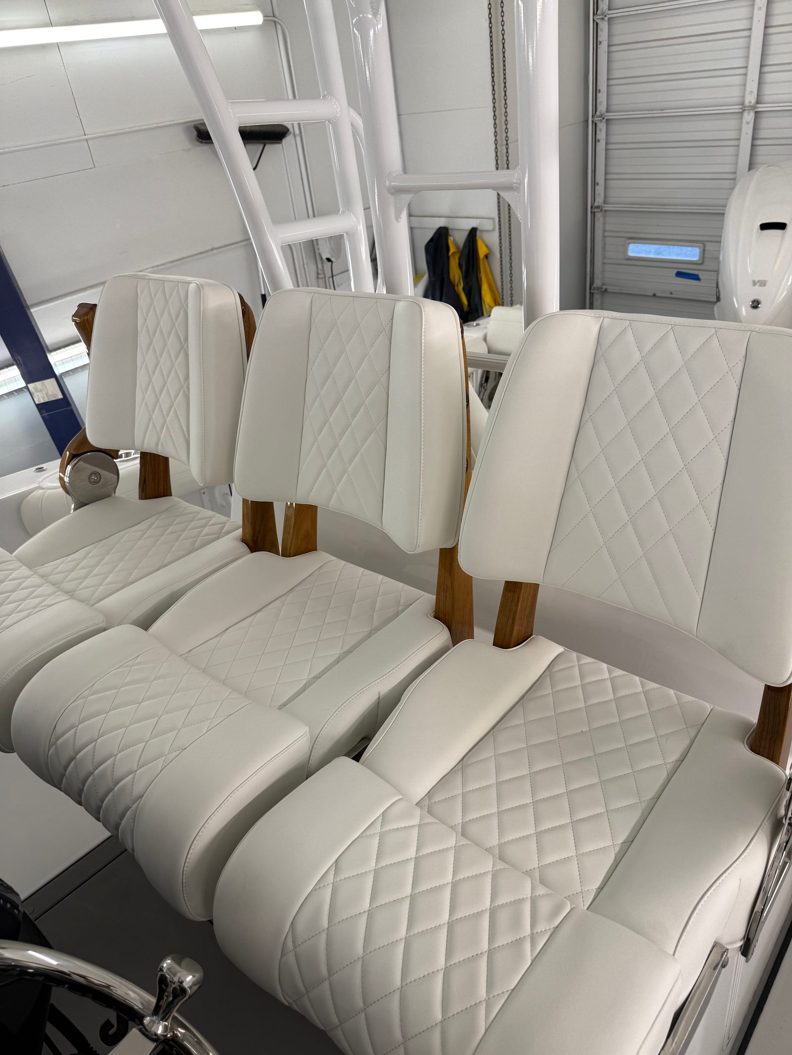 - Helm Seat Upgrade - Release teak ladder back helm seat pkg (3) with sliders. Replaces triple Pompanette helm seats