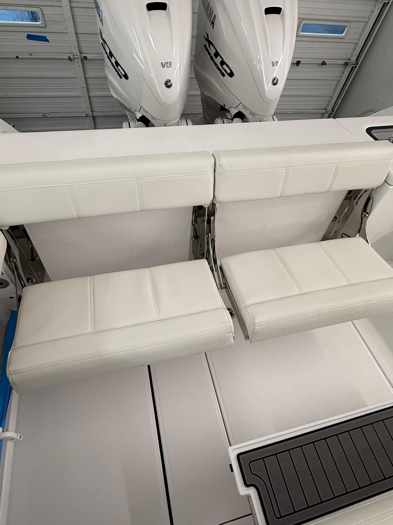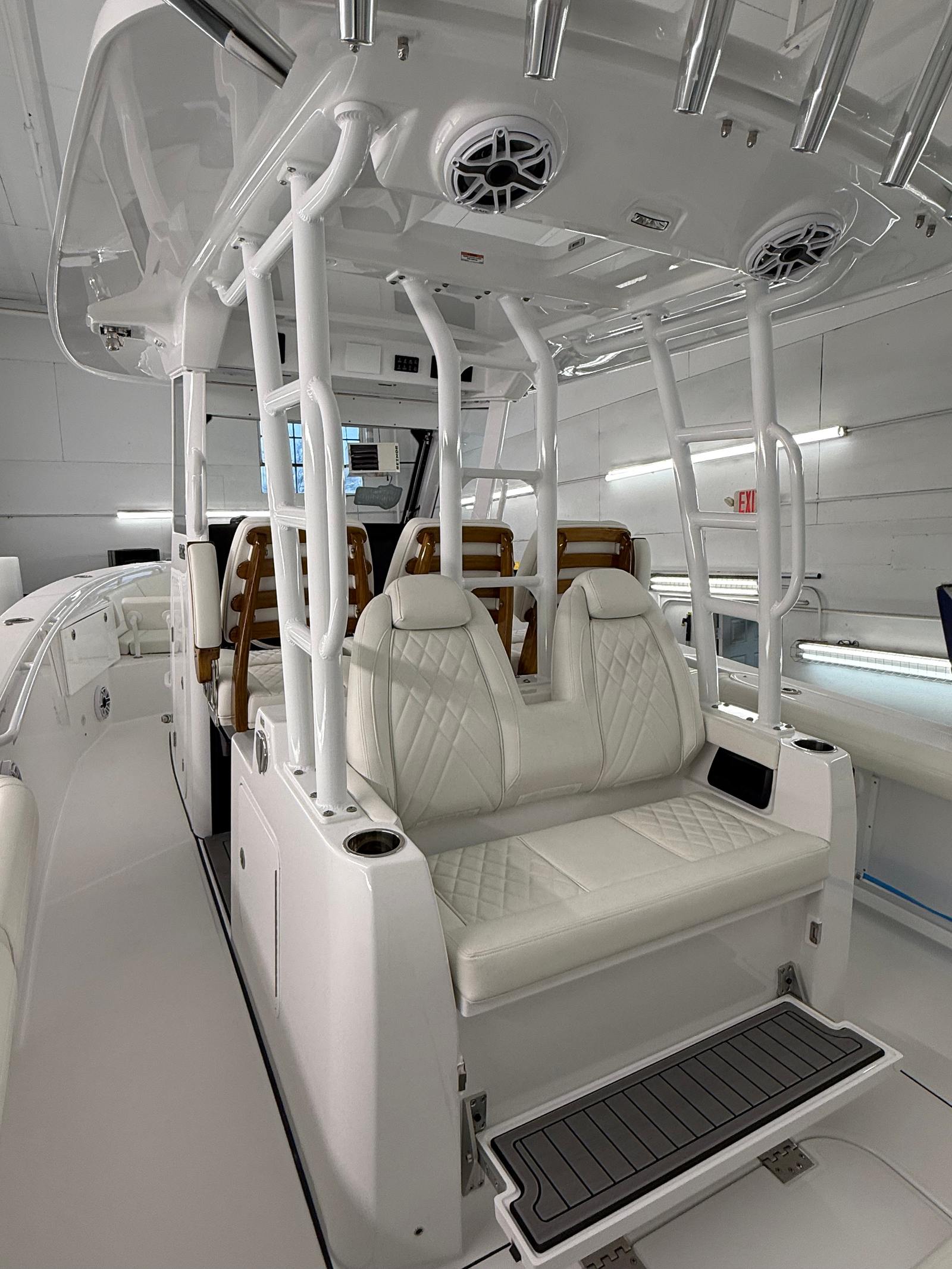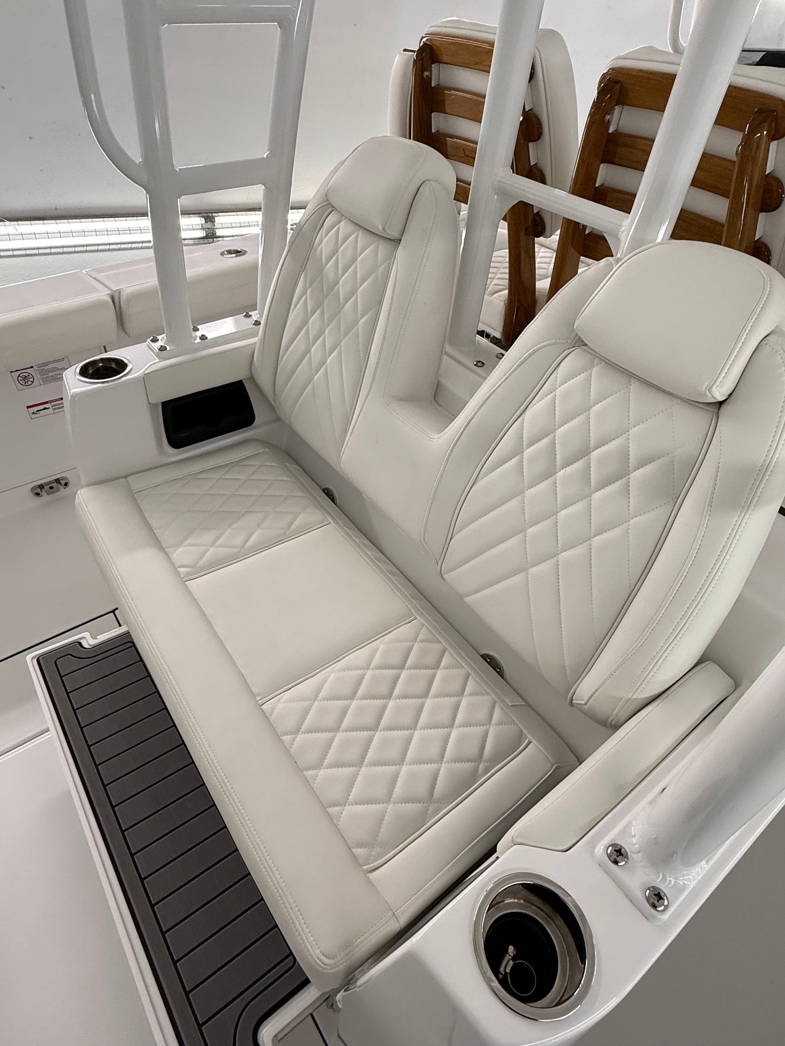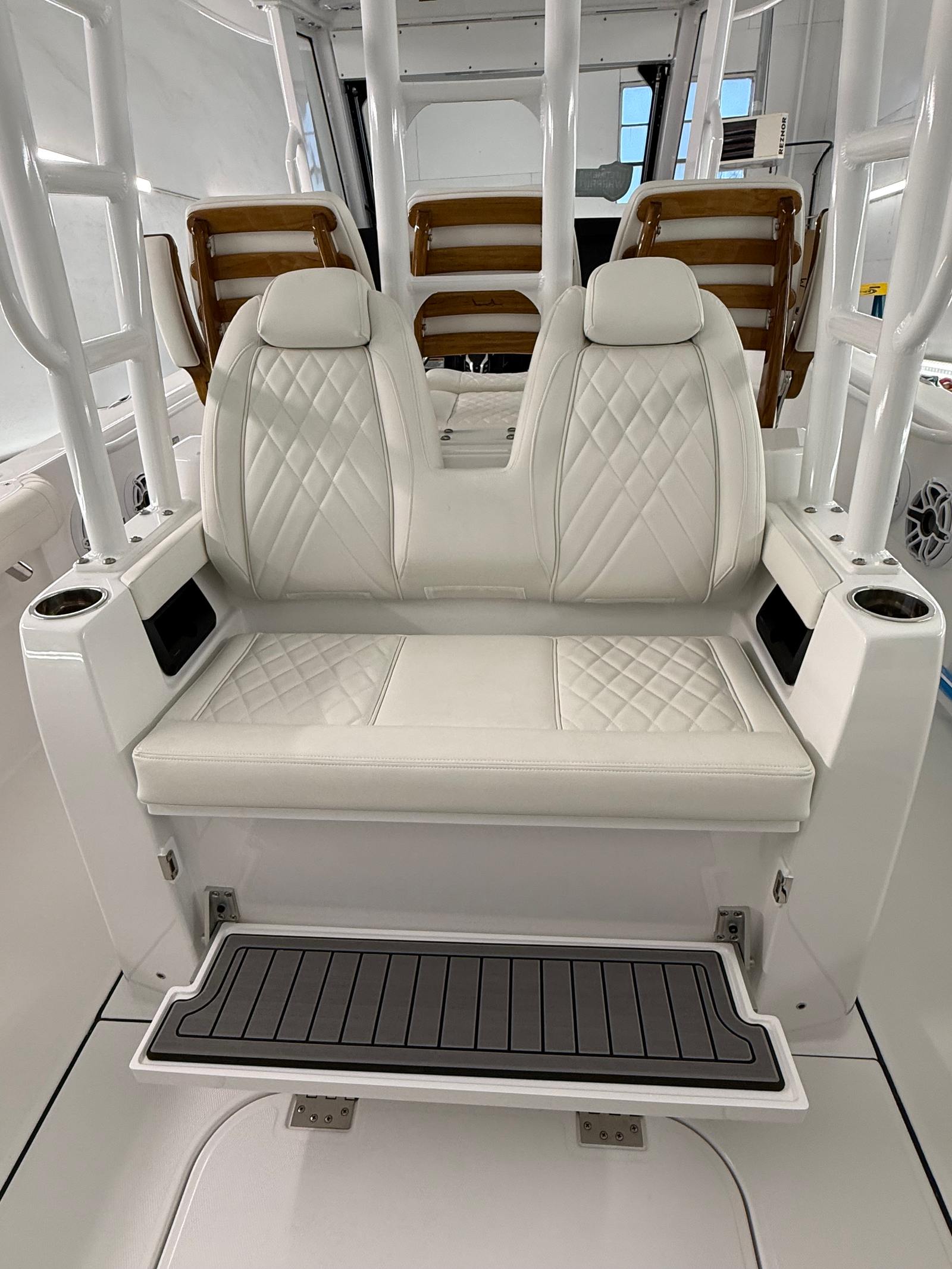This Center Console boat for sale is packed with premium features designed to enhance comfort, convenience, and versatility. The upgraded helm seat package replaces the standard triple Pompanette helm seats with three Release teak ladder back helm seats, each equipped with sliders for personalized comfort. The solid white upholstery and gel-white hull color not only look fantastic but also offer durability and easy maintenance. The engine flushing system simplifies routine care, helping to keep your twin Yamaha engines running smoothly for years to come.For anglers and adventure seekers, the Everglades 335 CC comes equipped with 18-foot collapsible outriggers, making it easy to set up for offshore fishing. The chiller plate for the mezzanine seat adds a touch of luxury, keeping drinks and snacks cool during long days on the water. The silver canvas and Mediterranean bow shade provide shelter from the sun, ensuring that everyone on board stays comfortable even during the hottest summer afternoons.