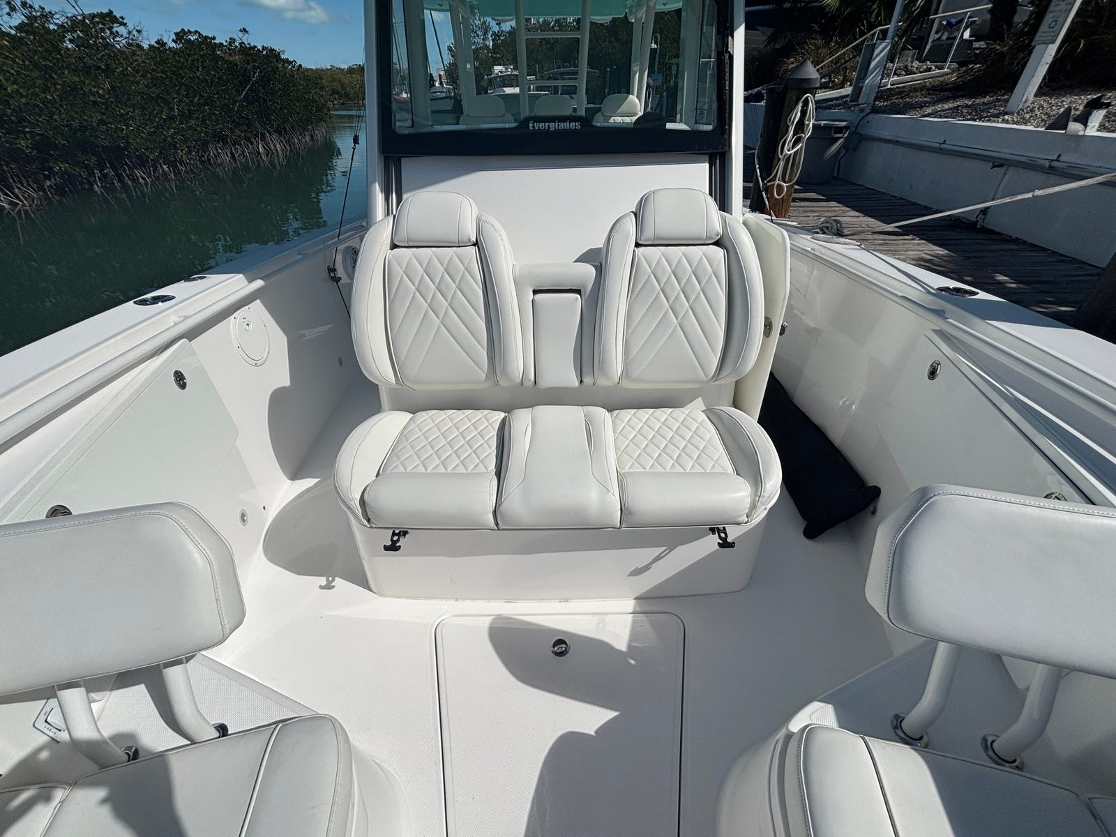 The Everglades 335 CC is as practical as it is enjoyable. The center console configuration allows for easy access to all parts of the boat, simplifying docking and maneuvering in tight spaces. Generous storage options keep your gear organized and out of the way, while the efficient design ensures that everything you need is within reach. The twin engines not only provide impressive power but also contribute to fuel efficiency, allowing you to spend more time on the water and less time at the fuel dock.This used center console boat is designed with convenience in mind, making it easy to maintain and operate. Whether you’re an experienced boater or new to the world of center consoles, the Everglades 335 CC offers a user-friendly experience that lets you focus on enjoying your time on the water.