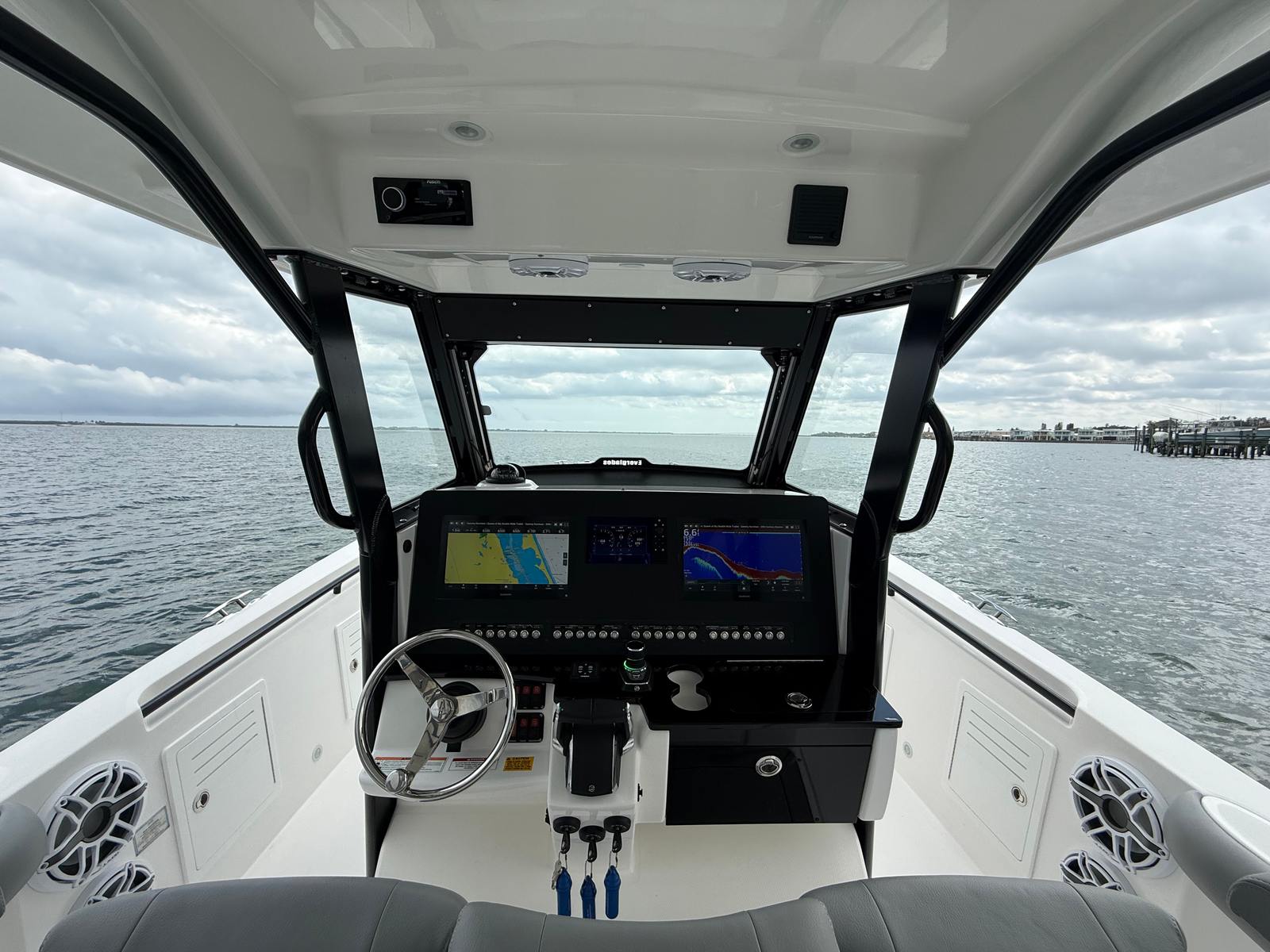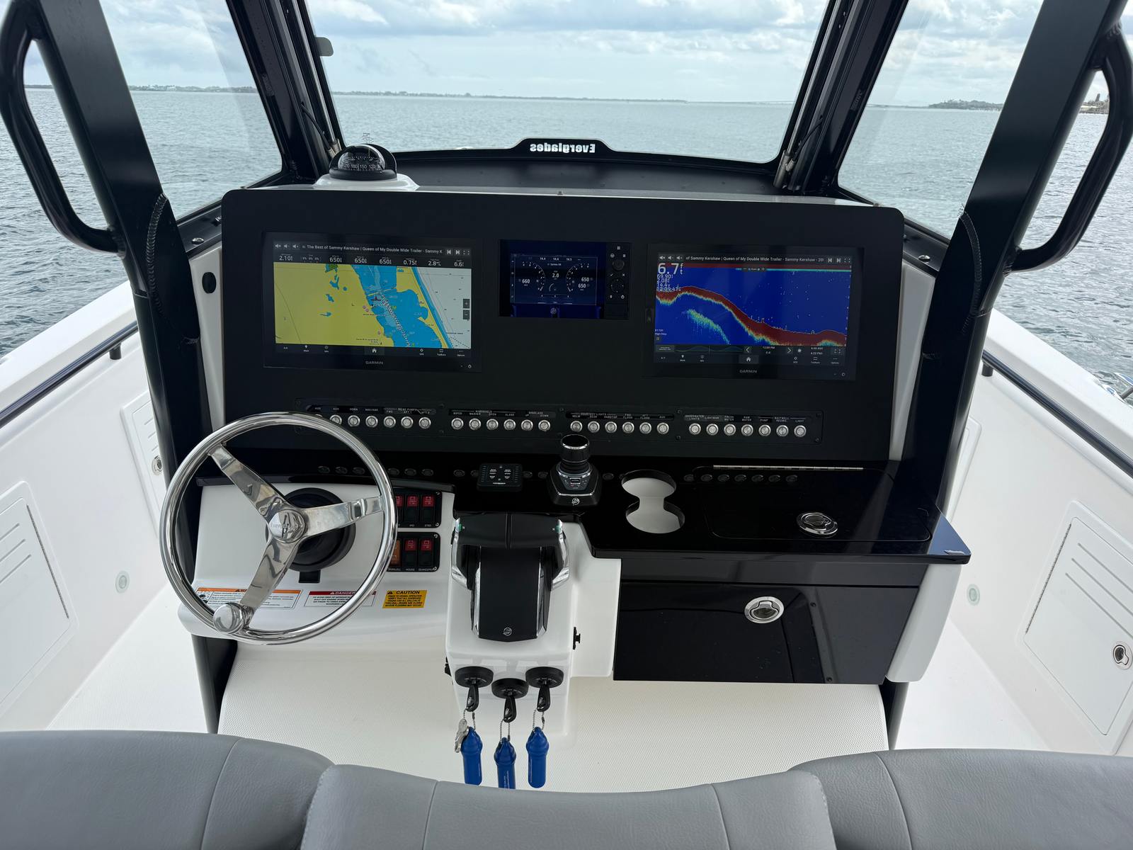 Step aboard to experience the Mediterranean bow shade in white, providing ample shade and comfort during sunny days. The premium Garmin VHF 315, AIS 800 transceiver, dual GPSMAP 8616xsv chart plotters, B175 high & low chirp transducers, Fantom 54 radar, GXM 54 Sirius XM & weather receiver, and engine flushing system ensure you stay connected, safe, and informed while out on the water. These advanced navigation and communication tools make the Everglades 365 CC not just a boat, but a reliable companion for all your maritime adventures.