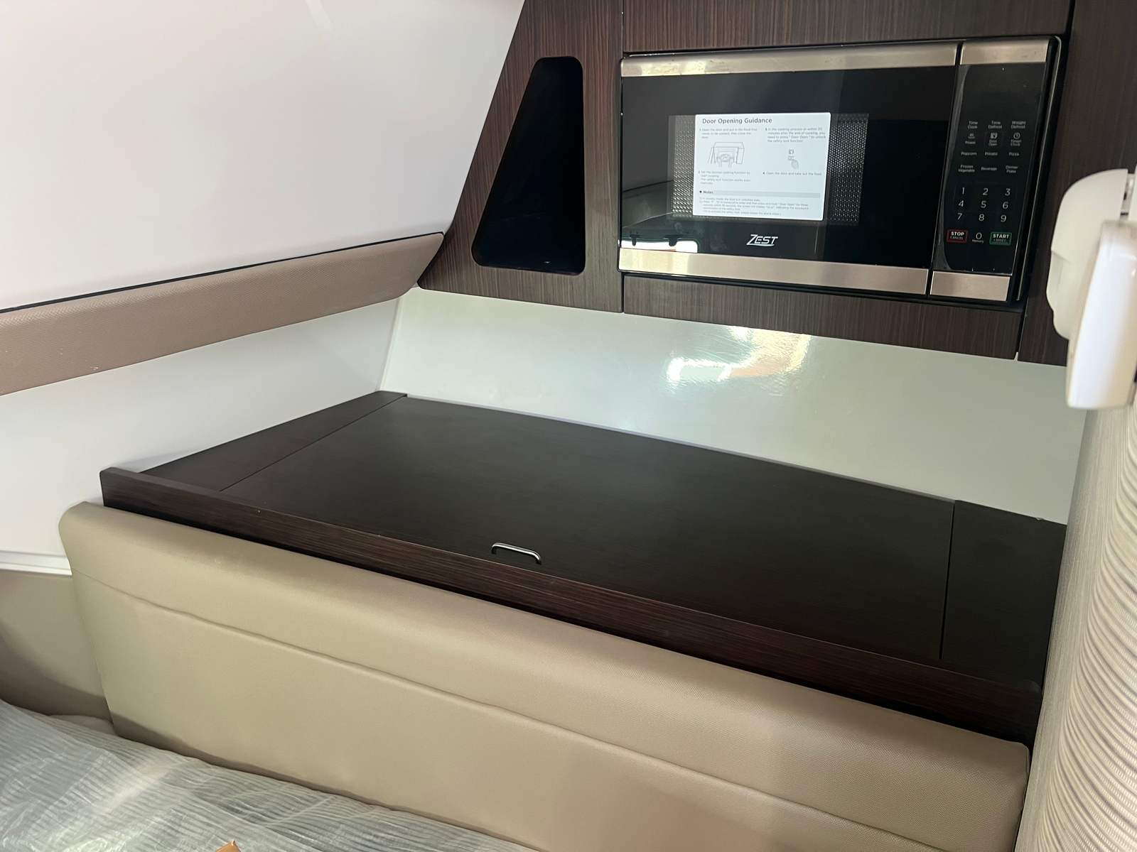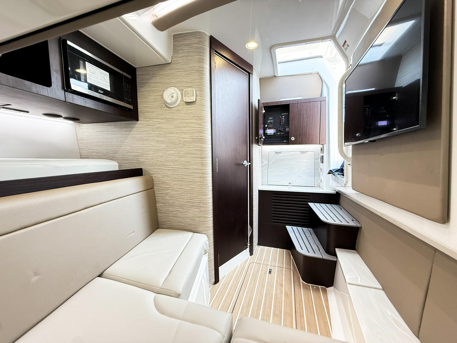 - Interior - Décor Upgrade – Adds additional interior accent panels, wood grained interior steps with storage, additional cabinet storage with doors, LED lighting with multiple color selections, Italian leather upholstered black steering wheel w/ white stitching, teak toilet seat cover, teak shower grate
