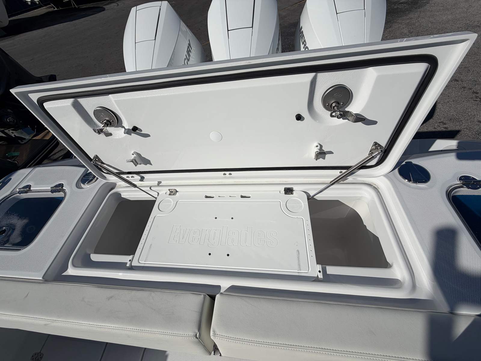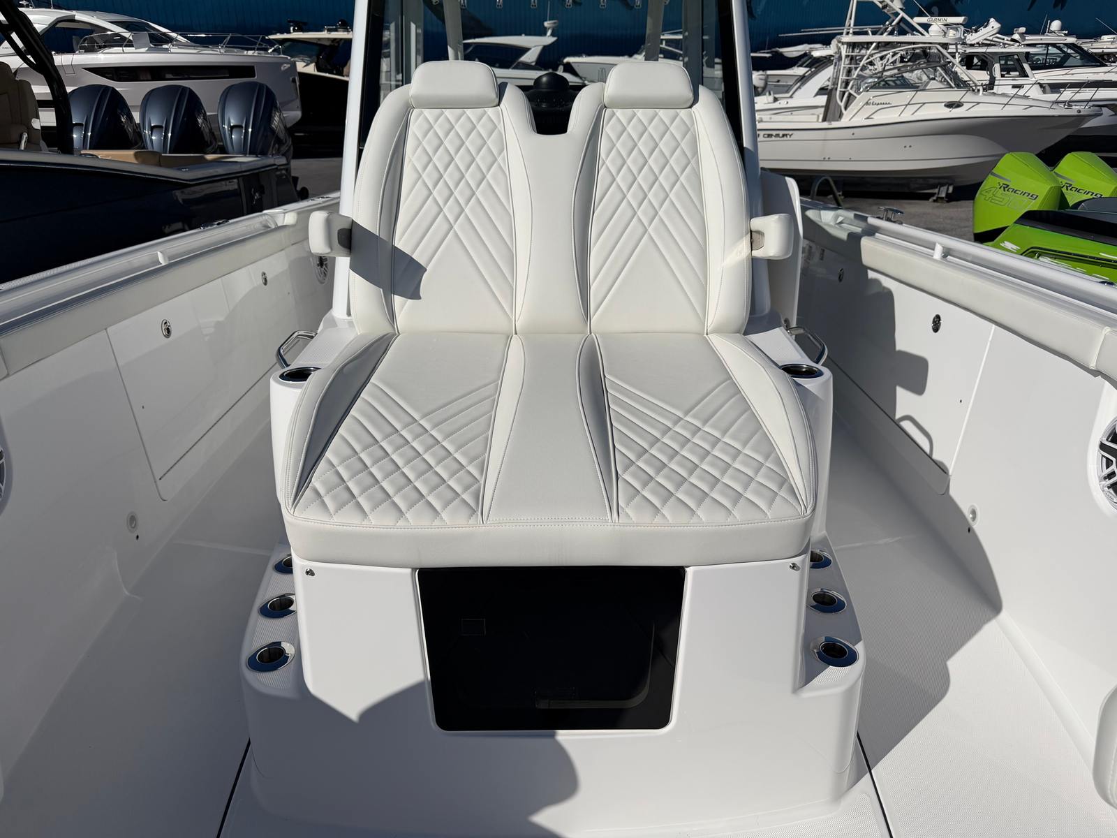 Power and precision are at the heart of the Everglades 375 CC. Equipped with triple Mercury 425 V10 engines, this Center Console boat boasts a combined 1275 horsepower, ensuring exhilarating speed and smooth handling in a variety of conditions. The advanced engine setup provides rapid acceleration and impressive top-end performance, making it ideal for offshore runs, water sports, or simply cruising along the coastline. Whether you’re navigating choppy waters or gliding across a calm bay, the Everglades 375 CC offers a responsive and stable ride that inspires confidence. The triple-engine configuration also enhances maneuverability, allowing for easy docking and tight turns when needed.