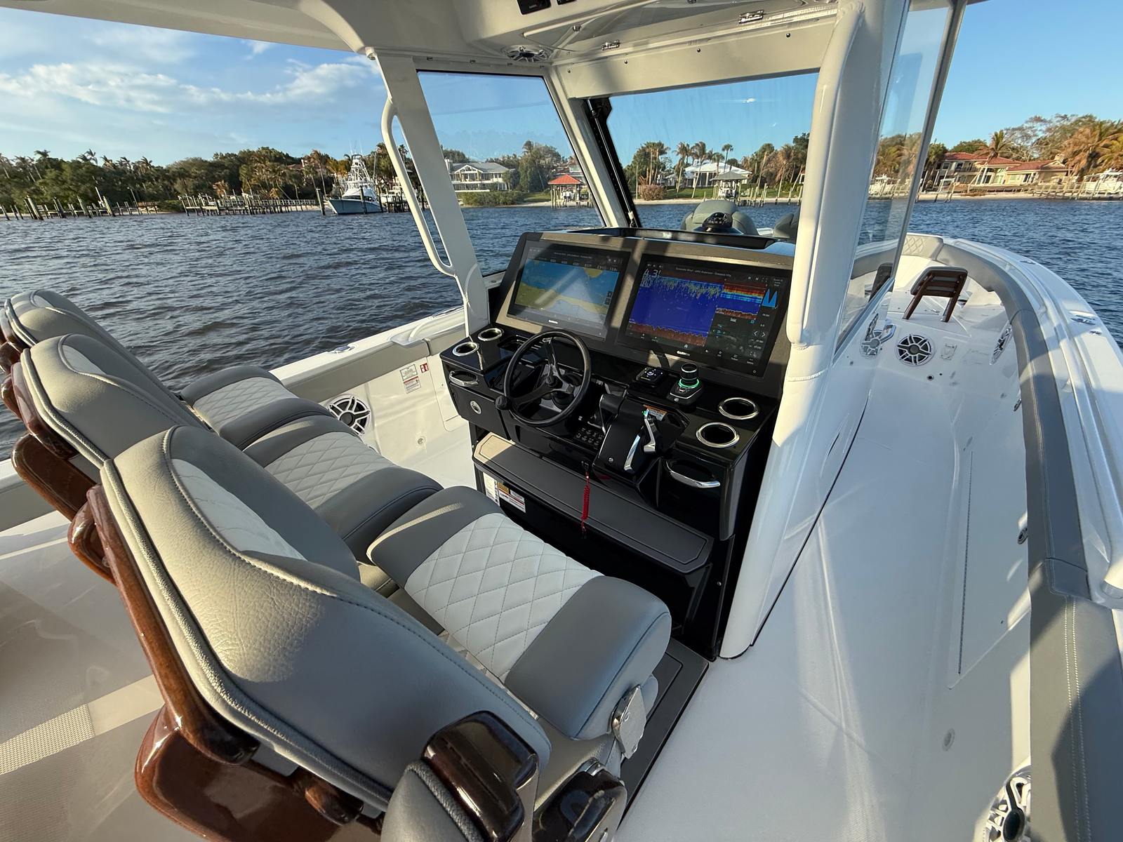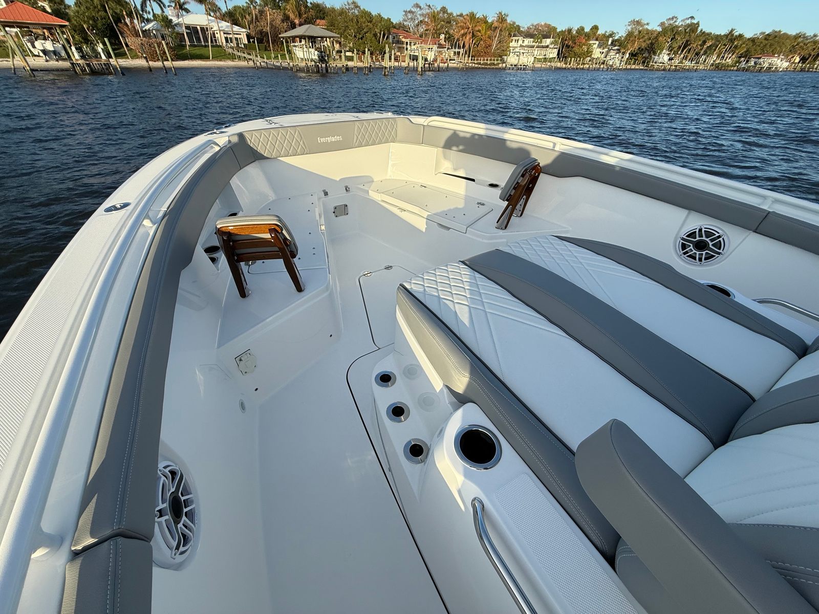 The Everglades 375 CC is as practical as it is luxurious. Its spacious layout provides plenty of room for gear, coolers, and personal items, making it easy to stay organized on longer trips. The under gunnel power ports offer convenient charging options for phones, tablets, and other electronics, ensuring you are always prepared.Docking and maneuvering are made simple thanks to the boat’s advanced engineering and responsive controls. The electrical convenience package streamlines onboard systems, reducing hassle and allowing you to focus on enjoying your time on the water. The Seakeeper 3 gyrostabilizer enhances safety and comfort, making it easier to entertain guests or fish in varying conditions.Fuel efficiency is optimized by the state-of-the-art Mercury V10 engines, allowing you to cover more water with fewer stops at the pump. Whether you are planning a weekend getaway or a quick afternoon escape, the 375 CC is designed to make every aspect of ownership enjoyable and stress-free.
