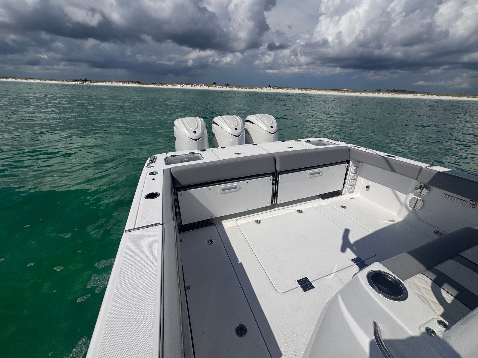 The Everglades 375 CC is as practical as it is luxurious. The ample storage options throughout the boat make it easy to stow gear, tackle, and personal items, keeping the deck uncluttered and safe. The ease of docking, thanks to the Joystick system, means you can confidently navigate marinas and tight spaces, regardless of your experience level.Fuel efficiency is optimized through the advanced engine technology, allowing you to cover more water with fewer stops at the pump. Maintenance is simplified with the triple engine flushing system, helping to extend the life of your engines and reduce downtime. The protective canvas covers ensure that your investment remains shielded from the elements, preserving its beauty and value for years to come.
