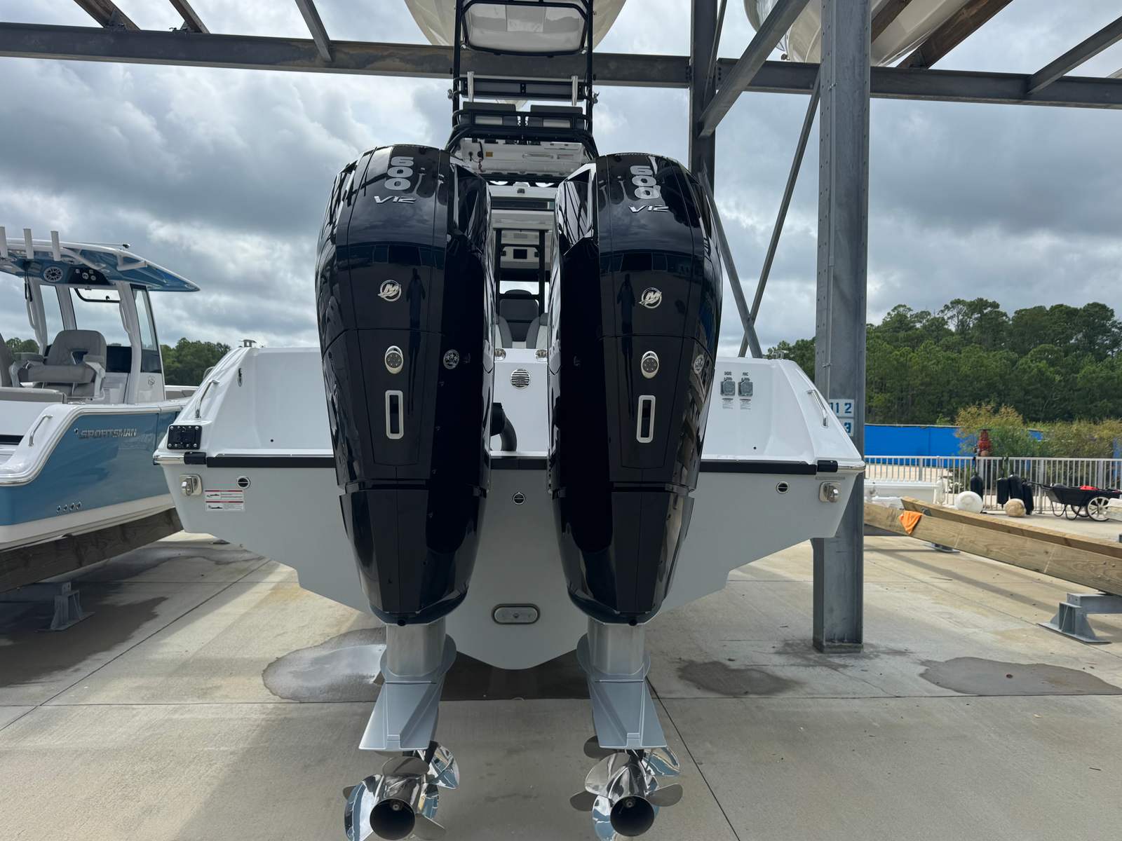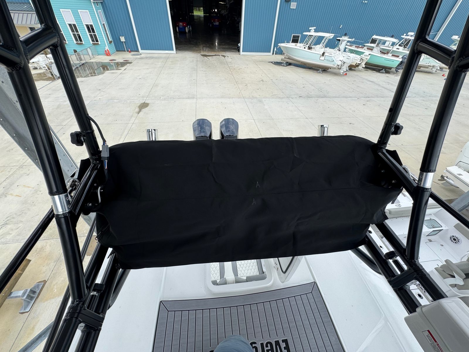The Everglades 395 CC is loaded with premium features that enhance both functionality and luxury. The Lumitec Lightbar and a set of three spotlights provide superior visibility for early morning departures or nighttime returns, ensuring safety and convenience. The Canvas Package, including an upper station, seat, and console, is finished in a striking black color, offering both protection from the elements and a sophisticated aesthetic.For those who demand comfort at the helm, the shock-mitigating helm seat pedestals (three in total) replace traditional storage drawers, delivering a smoother ride and reducing fatigue during long journeys. The black powder coating extends to the radar and satellite (if chosen), adding a sleek, unified look to the vessel’s profile. The carbon fiber steering wheel upgrade offers a tactile, high-performance feel, while the engine flushing system simplifies maintenance and extends engine life.Teak accents, featured on the dash, cup holders, and armrests, add a touch of classic elegance, especially when paired with the bright finish and Flint Gray upholstery. The Makefast powered awning provides instant shade and comfort, allowing you to create the perfect environment for relaxation or entertaining guests.