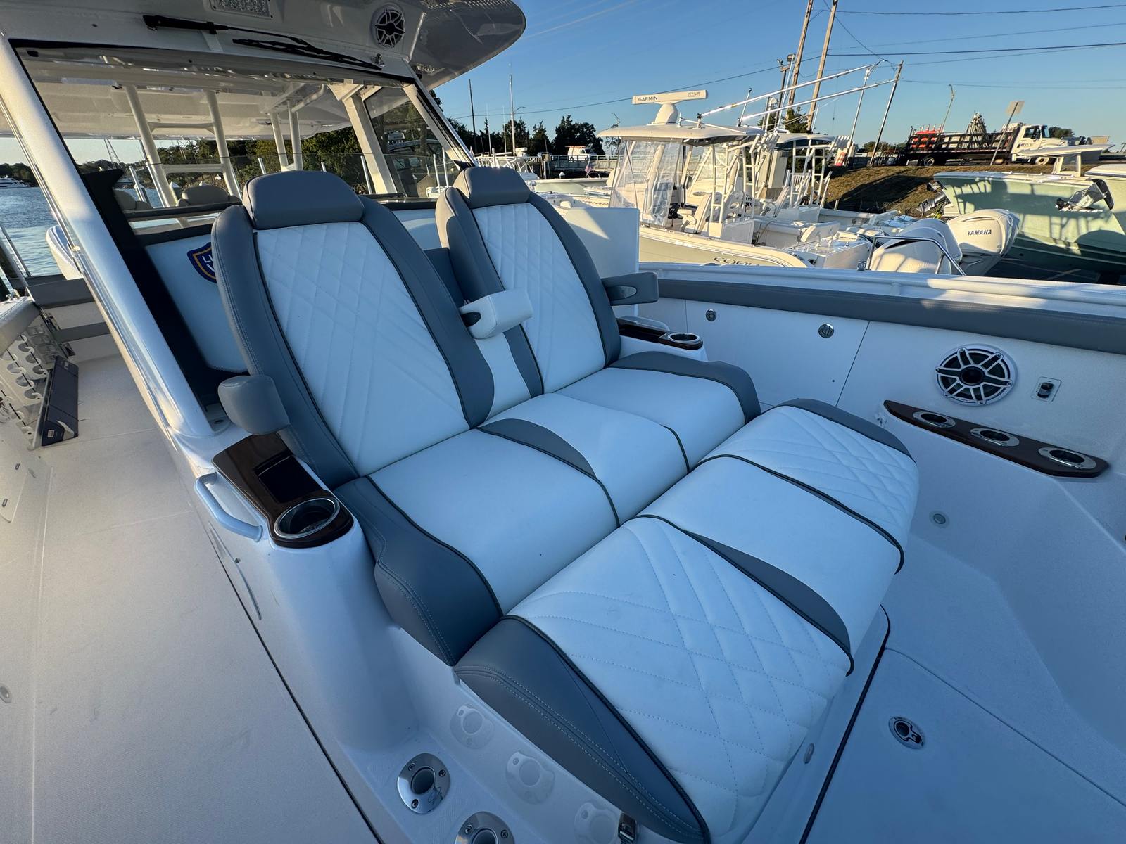 Powering the Everglades 395 CC are three Yamaha Helm Master EX Triple Engine XF450NSA2 outboards, delivering a combined 1350 horsepower. This formidable setup ensures exhilarating acceleration, smooth cruising, and impressive top speeds, making it ideal for both offshore adventures and leisurely coastal excursions. The advanced Yamaha Helm Master EX system features autopilot and joystick controls, offering precise handling and effortless maneuverability, even in challenging conditions. Whether you’re docking in tight spaces or navigating open waters, you’ll appreciate the confidence and control these engines provide.