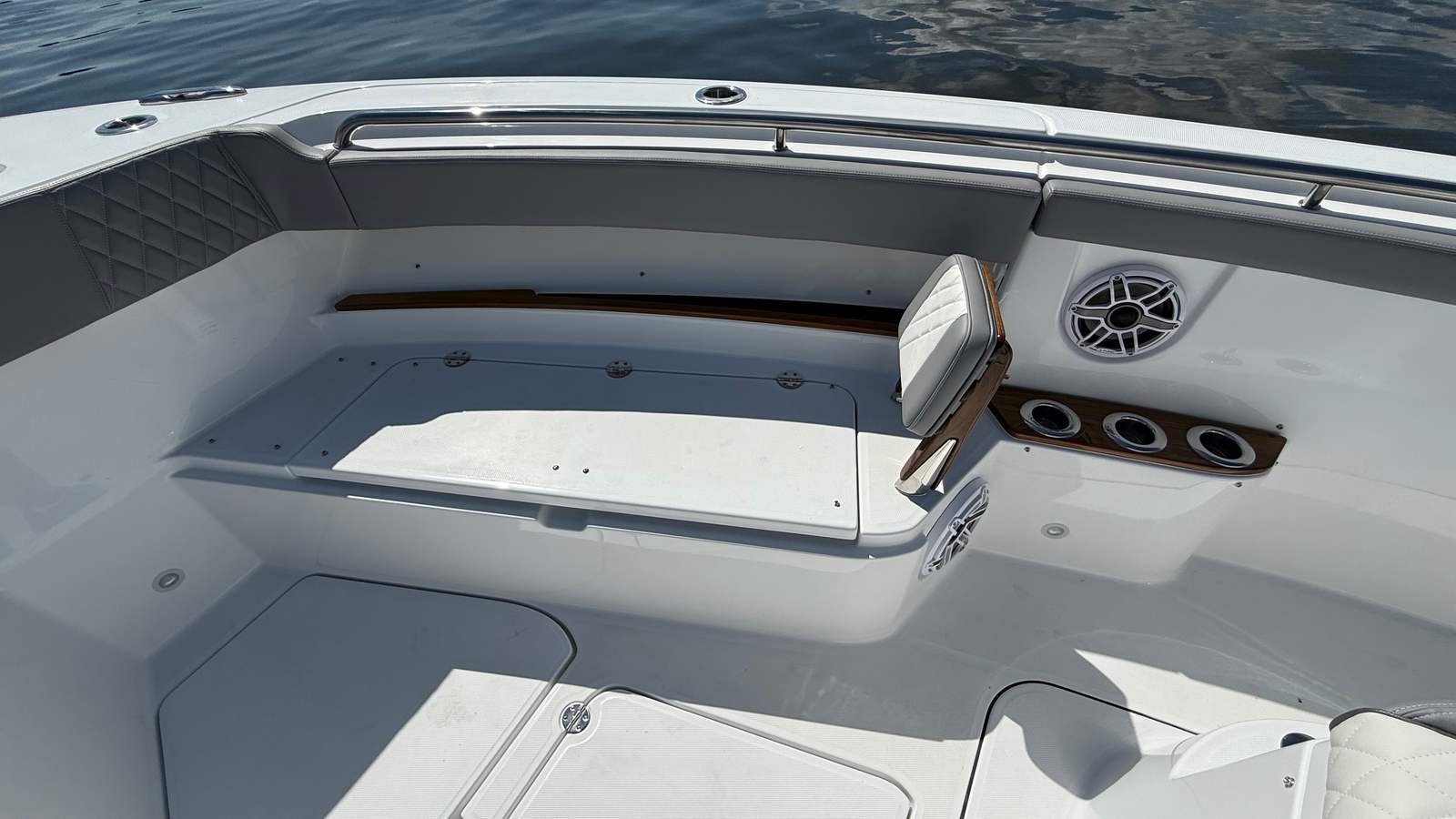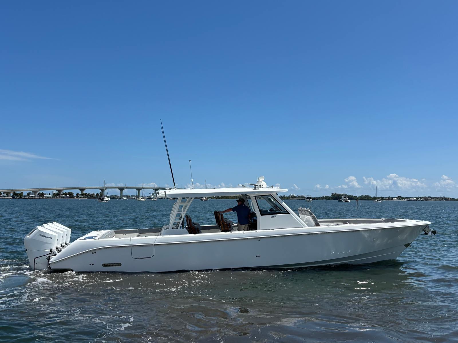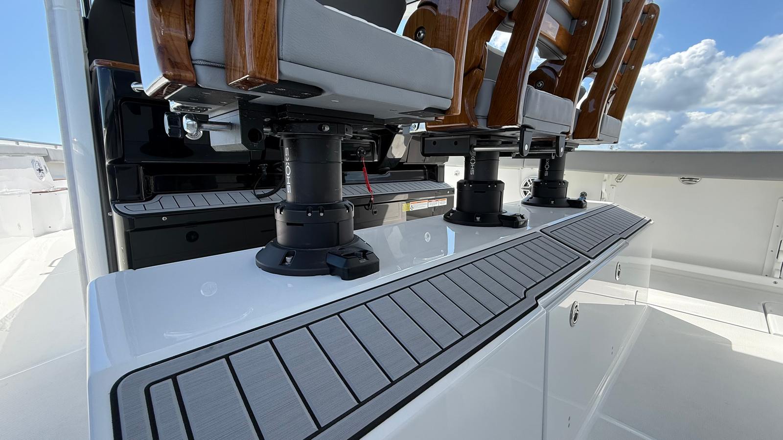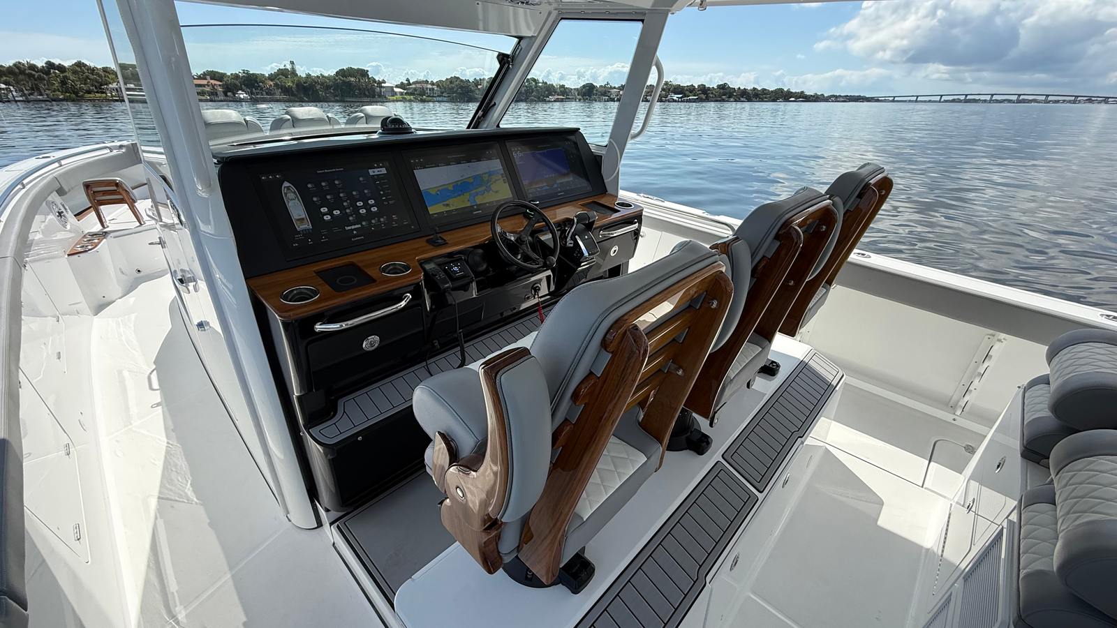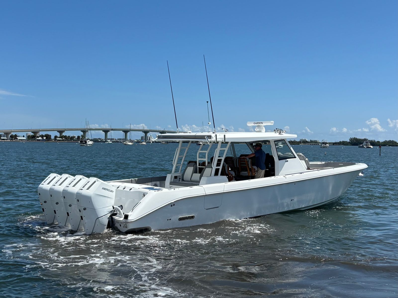 At the heart of the Everglades 455 CC is a powerhouse of performance. Equipped with four Mercury V10 Quad Engines, each delivering 425 horsepower, this center console boat boasts a total of 1,700 horsepower. The advanced Mercury engines are finished in a striking white, complementing the boat’s sophisticated appearance. The inclusion of joystick control and autopilot technology ensures that handling this vessel is both intuitive and precise, whether you are navigating tight marinas or cruising open waters. The combination of raw power and cutting-edge control systems makes the Everglades 455 CC a joy to pilot, offering exhilarating speed, smooth acceleration, and responsive maneuverability.