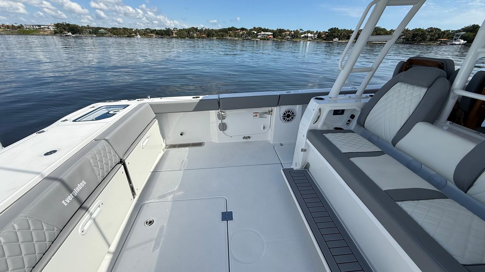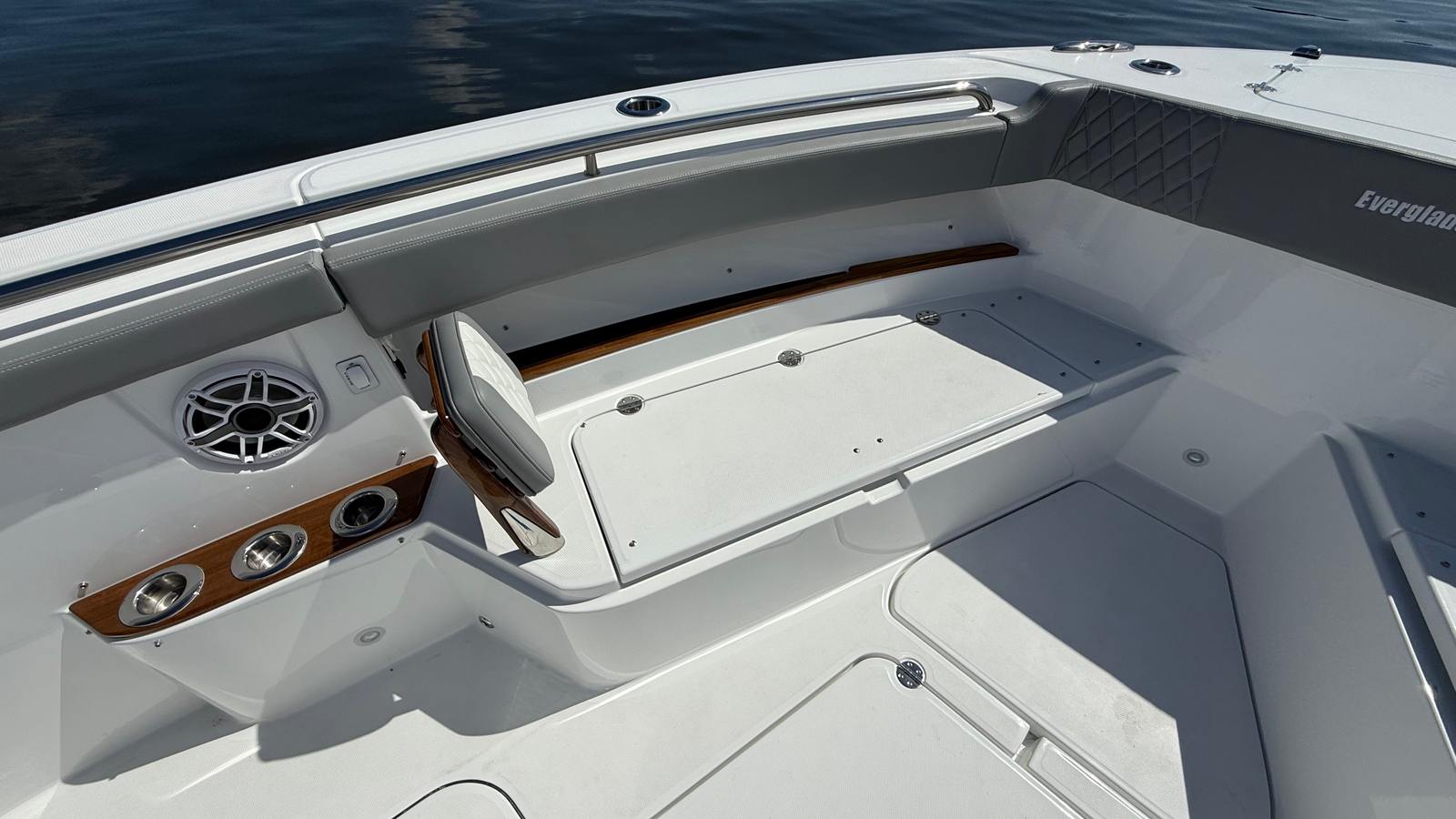 The Everglades 455 CC is as practical as it is luxurious. The joystick and autopilot features simplify docking and close-quarters maneuvering, making it easy for boaters of all experience levels to handle this impressive vessel. The spacious aft fish box provides ample storage for your catch or gear, while the internally rigged outriggers streamline your fishing setup and keep the deck organized.The durable hull and premium canvas package offer protection from sun, wind, and spray, ensuring that you and your guests stay comfortable during long days on the water. The boat’s generous length and smart design also provide plenty of storage for personal items, water toys, and safety equipment, keeping the deck clutter-free and ready for action.