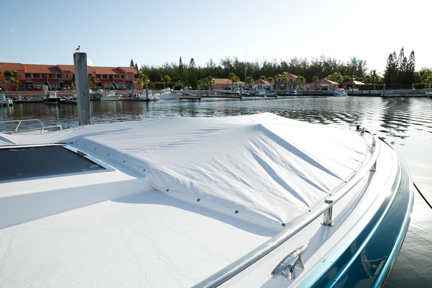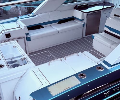 Woodgrain vinyl decking on swim platform and throughout the cockpit