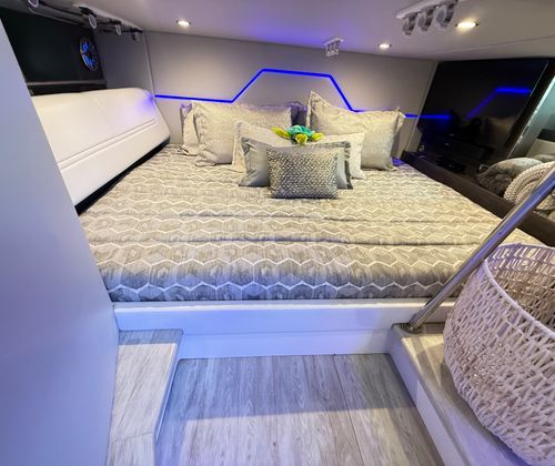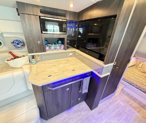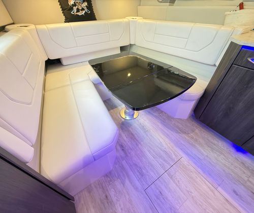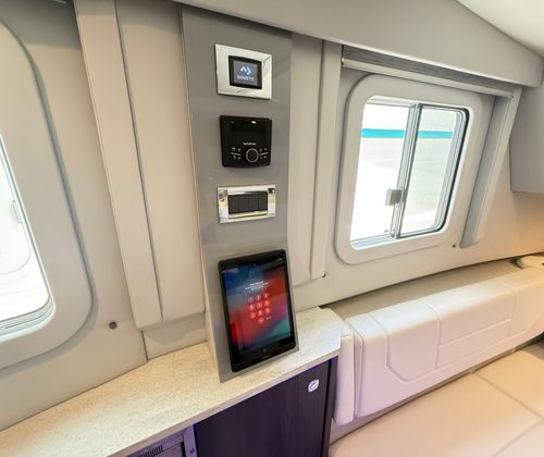 Rockford Fosgate stereo with Bluetooth connectivity, dash-mounted stereo control head with full color display, USB & MP3 ports, remote controller at the bow area, JL Audio M6 blue LED lighted speakers (six hardtop, four cockpit), 1000W stereo amplification and two 200W subwoofers