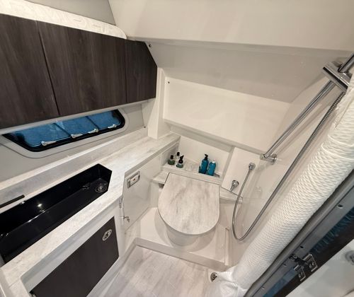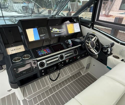 full height tinted windshield with wiper, port walk-thru door side wing glass vents and large, motorized opening coupe-top, glass sunroof with retractable sunshades and soft panels, blue LED accent lighting, dual flagstaff, flush mount LED spreader lights, flag staff and white dual air horn