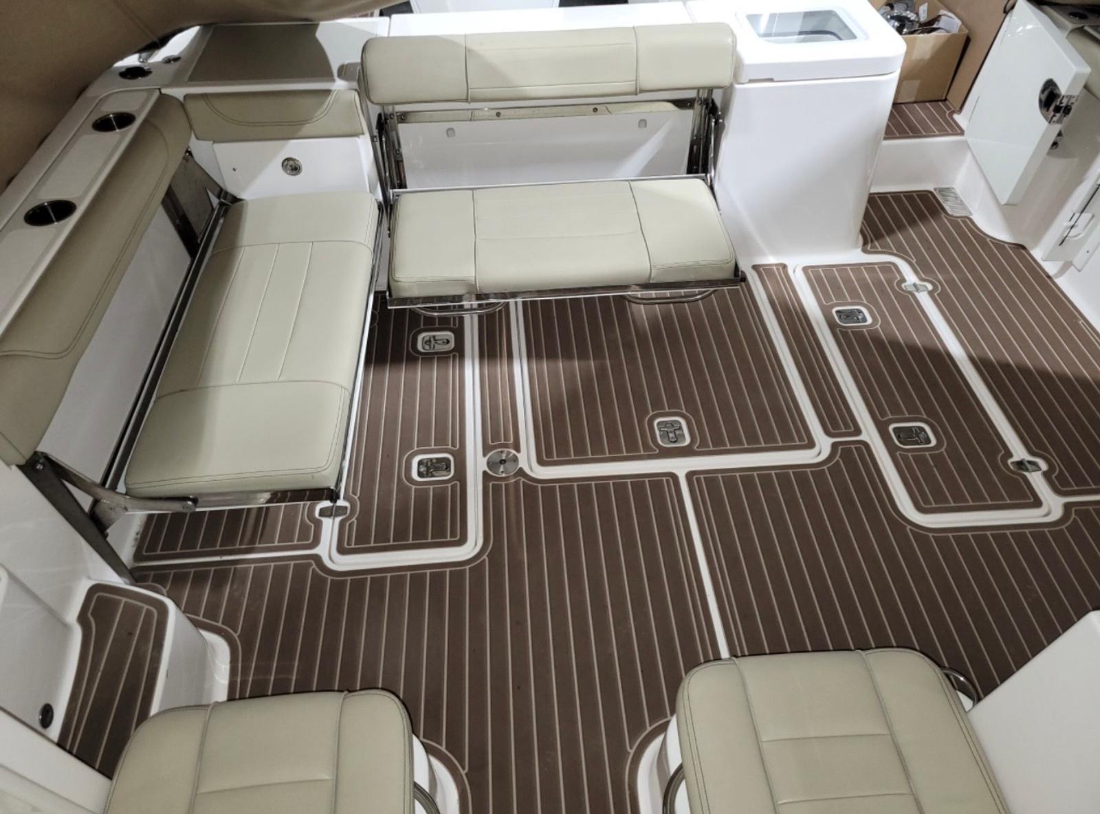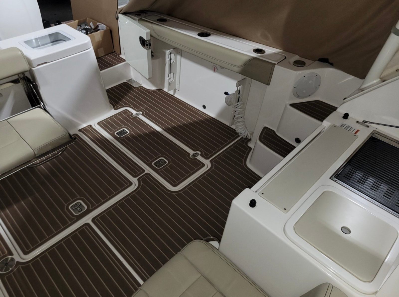 Beyond its luxurious features, the Pursuit 355 OS excels in practicality. The ample storage options allow you to keep your gear organized and easily accessible, whether you’re packing for a day trip or an extended voyage. The cockpit cover and drop curtain offer protection from sun and rain, helping to maintain the boat’s condition and ensuring comfort for all aboard. Docking and maneuvering are made easier thanks to the responsive twin engines and advanced controls, giving you confidence in tight spaces and busy marinas. The battery charger ensures your onboard systems remain operational, while the Sea Deck carpet provides a non-slip surface that’s both comfortable and safe. The inclusion of a cockpit grill and wet bar means you can enjoy gourmet meals and refreshing beverages without ever leaving the water, enhancing the overall boating experience.