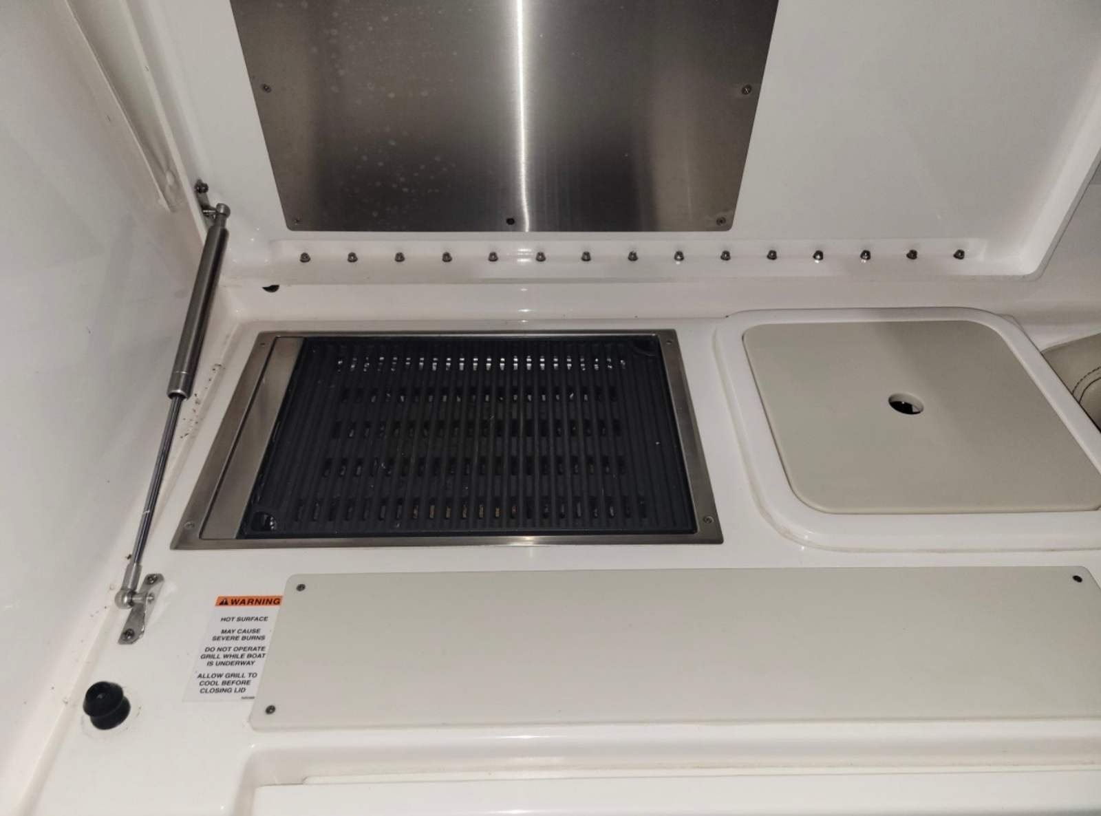 Step aboard the Pursuit 355 OS and you’ll immediately notice the attention to detail in its features and specifications. The aft bench seat provides a comfortable spot for guests to relax and take in the views, while the aft drop curtain offers protection from the elements, ensuring your outings remain enjoyable regardless of the weather. The cockpit is a true highlight, featuring a Sea Deck carpet that adds both style and comfort underfoot. The cockpit cover keeps your boat protected when not in use, preserving its pristine condition. For those who love to entertain, the cockpit grill is perfect for preparing delicious meals on the water, and the cockpit wet bar makes serving drinks a breeze. Ample cockpit storage ensures you have plenty of space to stow gear and supplies, keeping the deck clutter-free. The elegant cabinetry adds a touch of luxury to the interior, providing both functionality and aesthetic appeal. With a battery charger included, you can rest assured that your electronics and systems will remain powered throughout your adventures.