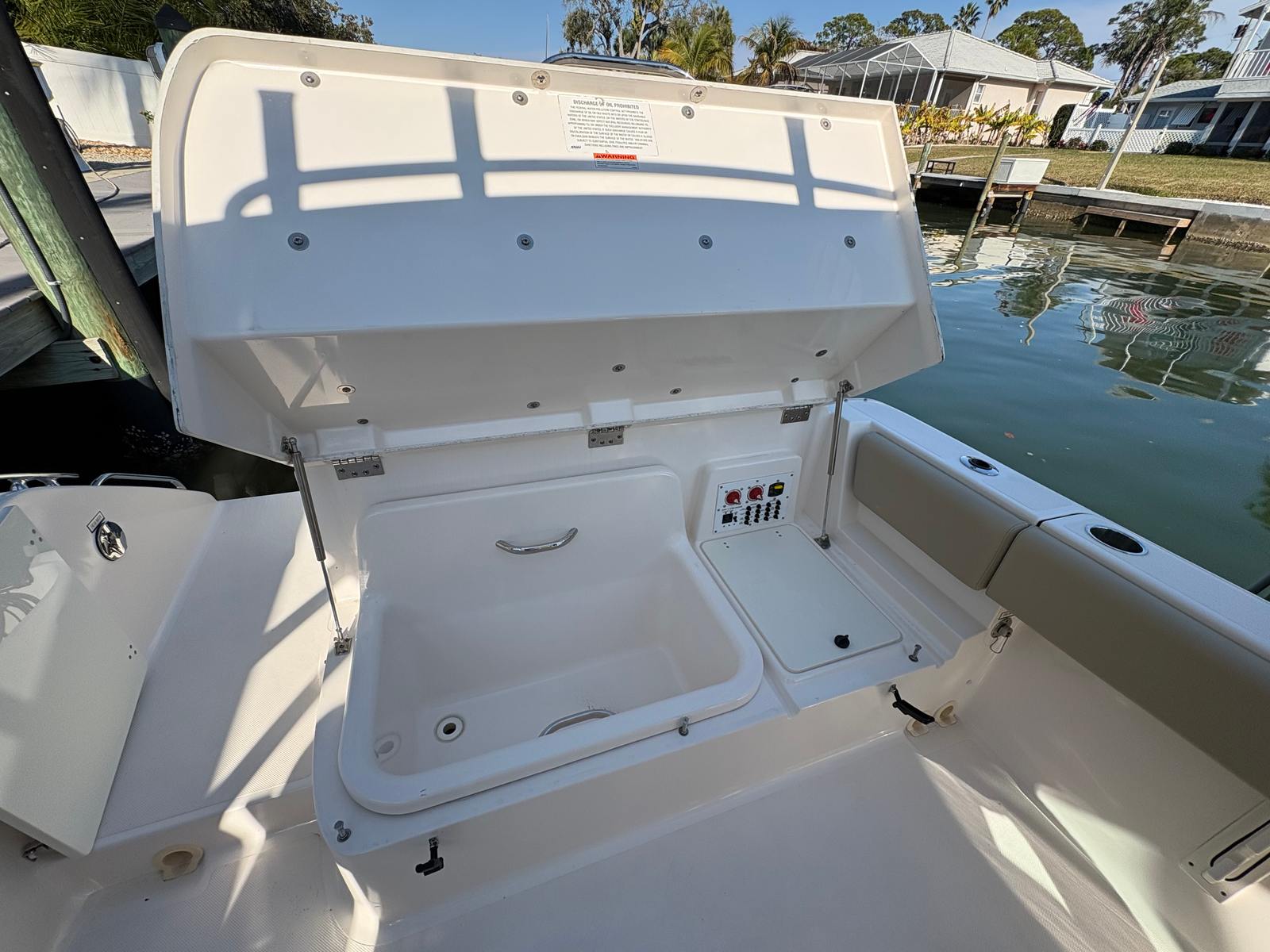 Fishing features include a livewell, fish box, and smart cockpit layout that easily transitions from offshore action to cruising with family and friends. There’s also tons of storage throughout, keeping gear organized and out of the way.