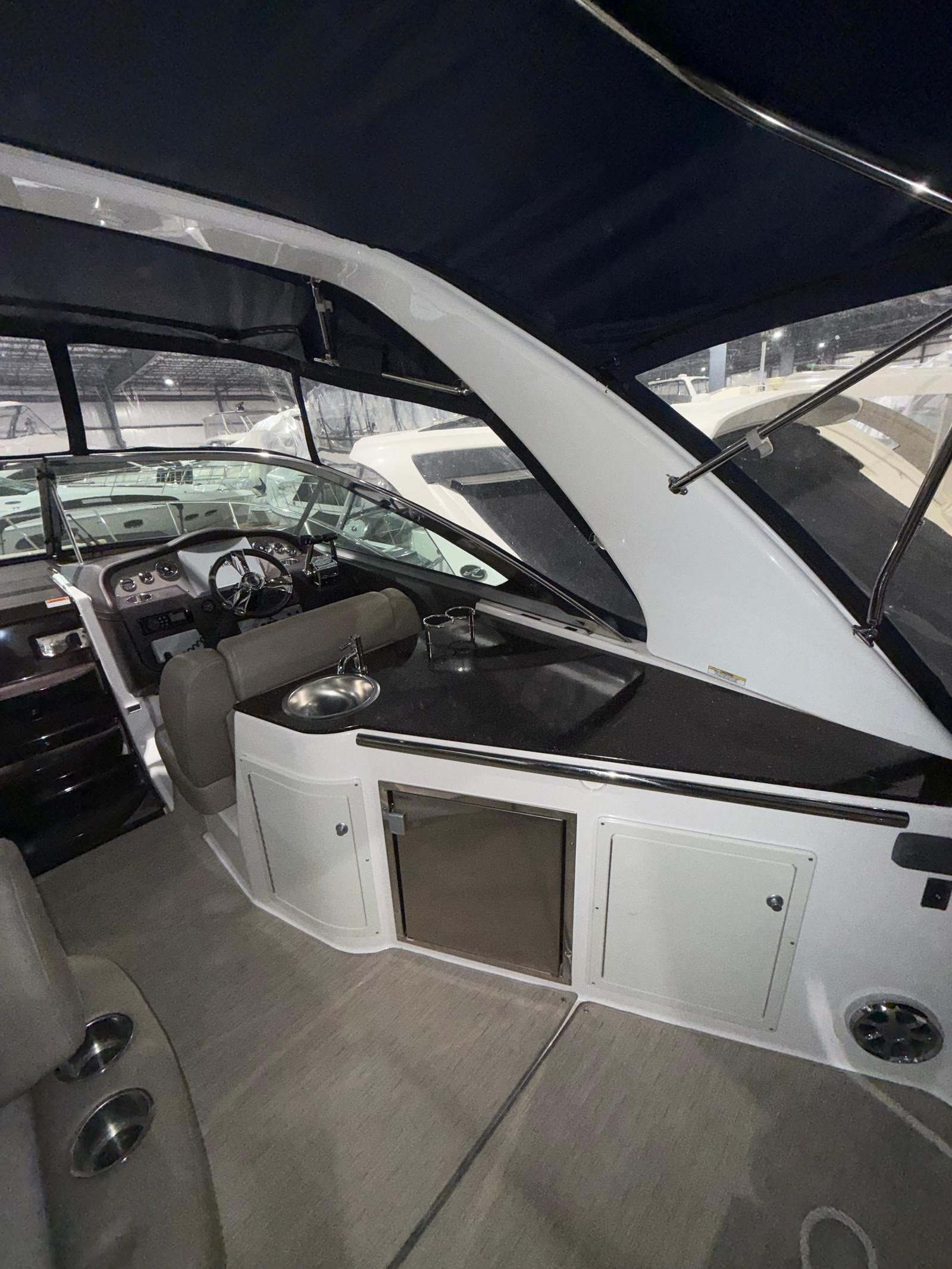 This cruiser boat for sale is equipped with a range of special features that enhance both comfort and convenience. The four onboard batteries ensure reliable power for all your electronics and amenities, while the battery charger keeps everything running smoothly during extended trips. The aft bench seat and aft cabin stateroom provide versatile seating and sleeping options, making it easy to accommodate family and friends for overnight stays or day cruises. Elegant cabinetry adds a touch of sophistication to the interior, offering practical storage solutions for your gear and personal items.The camper enclosure, featuring navy canvas that is only three years old, offers protection from the elements and extends your boating season. The cockpit carpet adds a layer of comfort underfoot, while the ample cockpit storage keeps your space organized and clutter-free. These features combine to create a welcoming environment that’s perfect for entertaining, relaxing, or simply enjoying the beauty of the water.