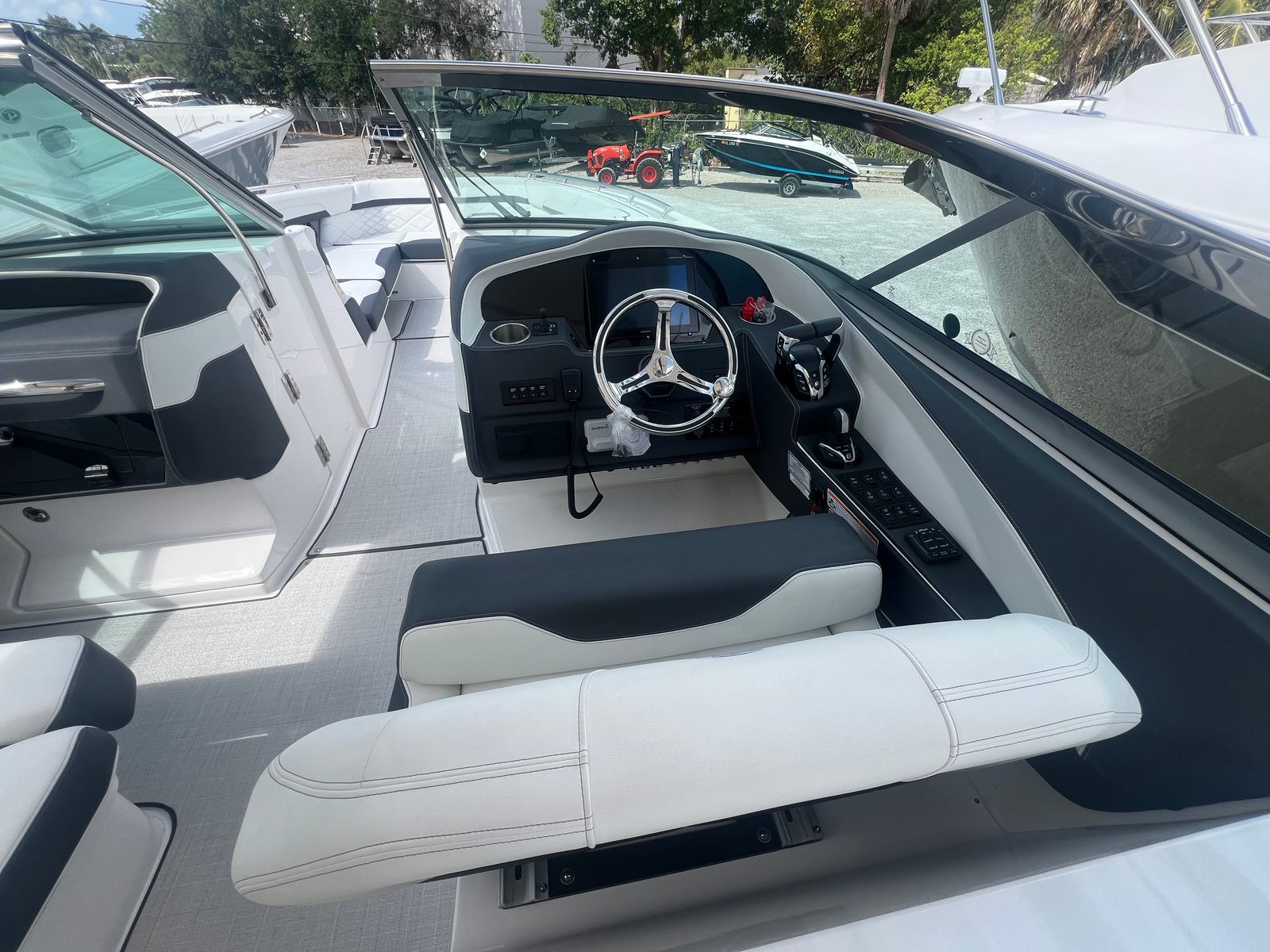The 2025 Regal 33 OBX is a new, meticulously designed bowrider that measures an impressive 34 feet in length. Its sleek profile and contemporary lines are accentuated by a striking Steel Grey hull, complemented by Titanium accents and a Tahiti Beach White bottom. The matching bootstripe adds a touch of sophistication, ensuring this bowrider turns heads at every marina. Regal’s commitment to quality is evident in every detail, from the premium materials to the thoughtful layout, making this model a true showpiece for those who appreciate both form and function.