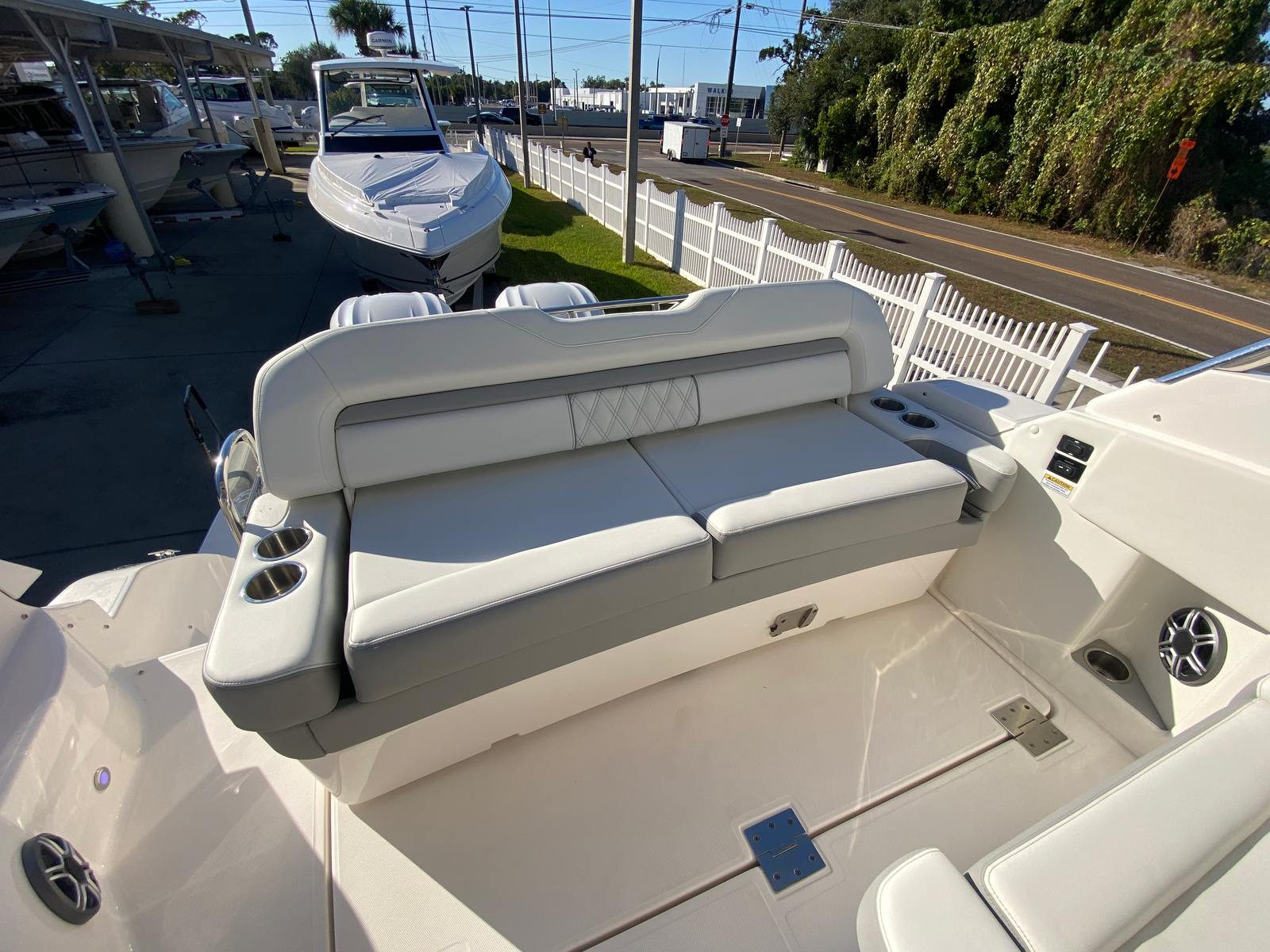 Practicality is at the heart of the Regal 33 XO’s design. The bow thruster simplifies docking, allowing you to maneuver with precision in crowded marinas or tight spaces. Fender clips offer quick and secure attachment points, streamlining the process of protecting your boat during docking. The absence of bottom paint means less maintenance and a cleaner hull, contributing to long-term performance and value.The aft cockpit electric Sureshade for the hard top provides adjustable shade, ensuring comfort during hot summer days or unexpected rain showers. The spacious layout offers plenty of storage for gear, supplies, and personal items, making it easy to keep the deck organized and clutter-free. Whether you are planning a day trip or an extended voyage, the Regal 33 XO is equipped to handle your needs with ease.