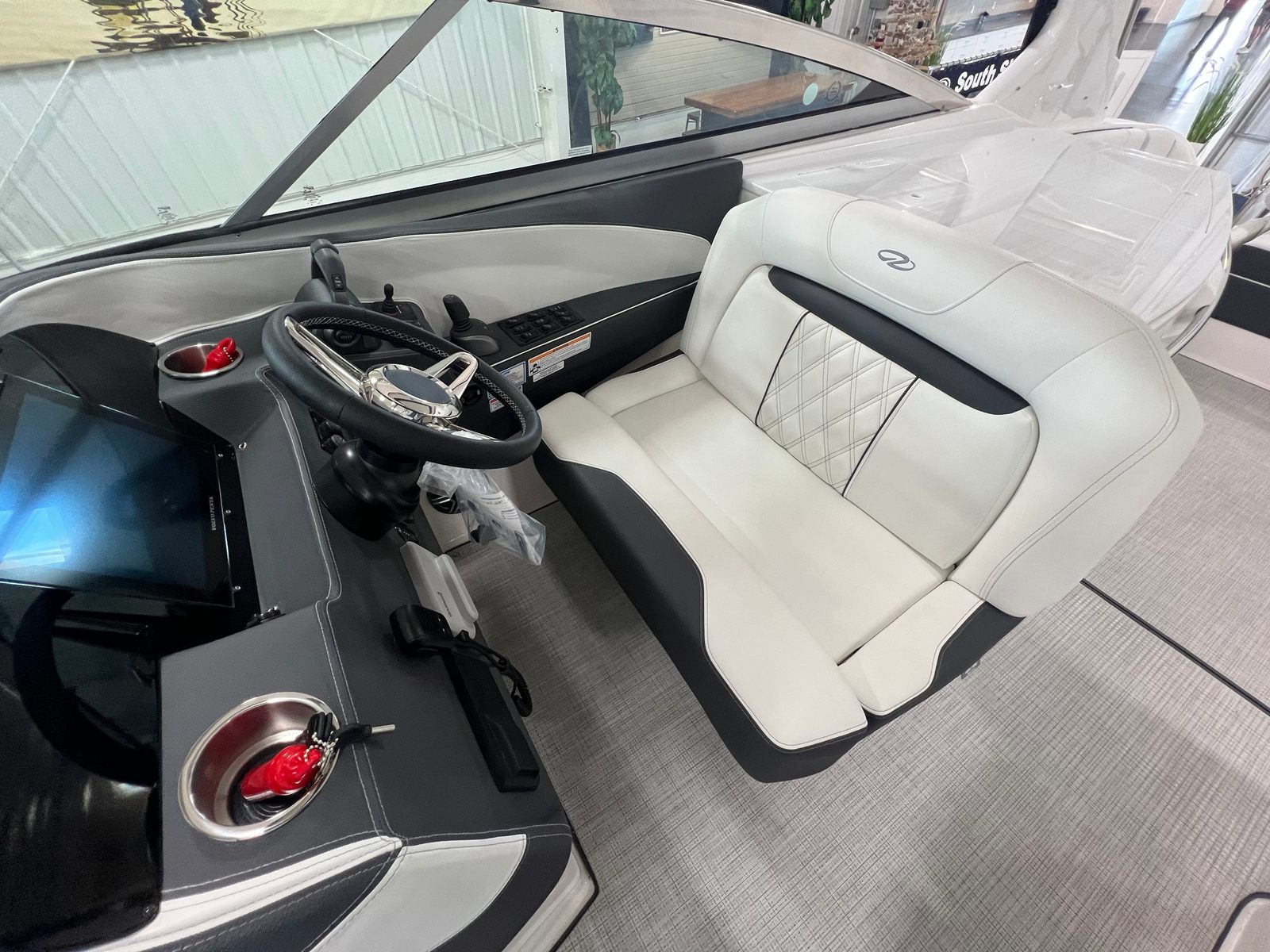 Practicality meets elegance in the Regal 3300 Bowrider. The ample storage throughout the boat ensures you have space for all your gear, from water toys to picnic supplies. The bow thruster and intuitive controls make docking and maneuvering simple, even for less experienced boaters. The efficient twin engines provide the power you need without sacrificing fuel economy, allowing you to spend more time on the water and less time refueling.The anchor windlass system streamlines the anchoring process, making it easy to stop and enjoy a swim or a meal on the water. The cockpit refrigerator keeps snacks and drinks chilled, while the seagrass mat offers a comfortable, non-slip surface for bare feet. With protective covers for both the bow and cockpit, you can keep your boat looking pristine with minimal effort.