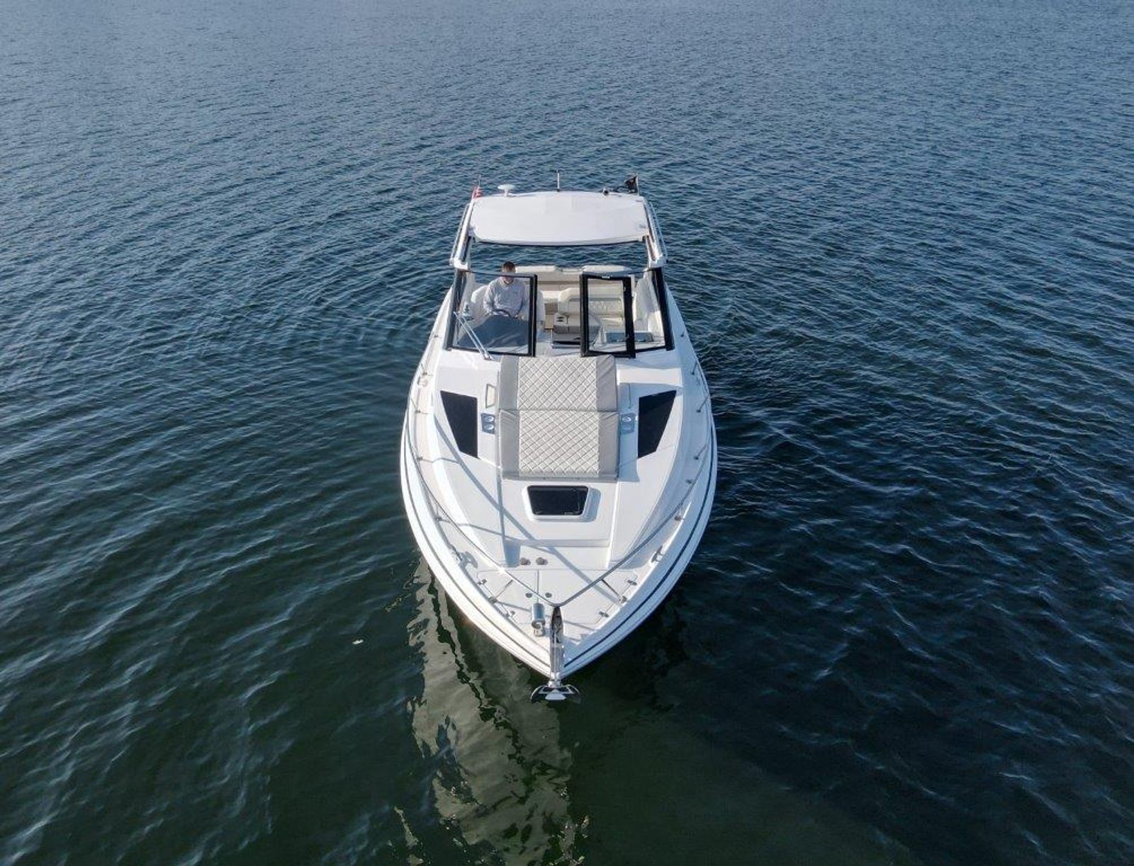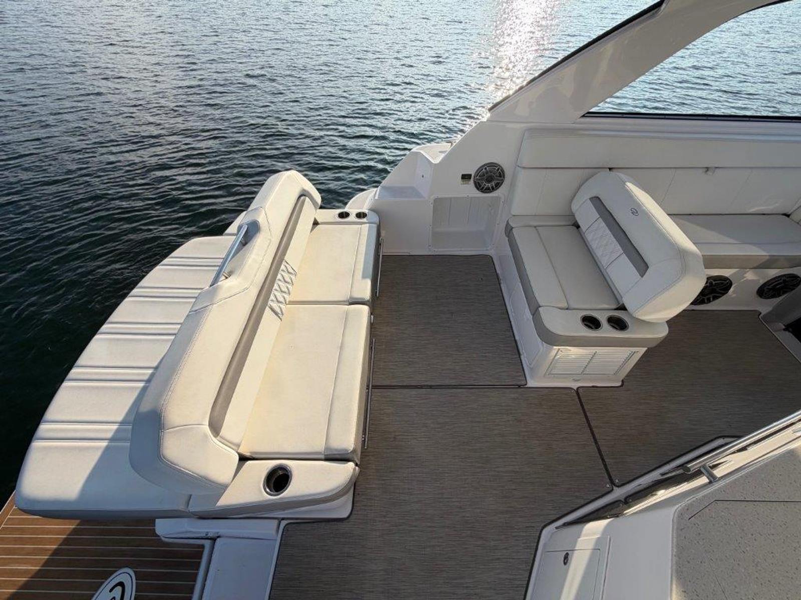 The retractable hardtop and hard enclosure make year-round boating comfortable, while the cockpit is built for entertaining. The full wet bar, flexible seating, and sliding Ultra Lounge (adds 11 inches at the touch of a button) keep the party going. The windshield walk-through provides full upright access to the bow, leading to the chase lounge sunpad—an ideal spot to relax and enjoy the sun.