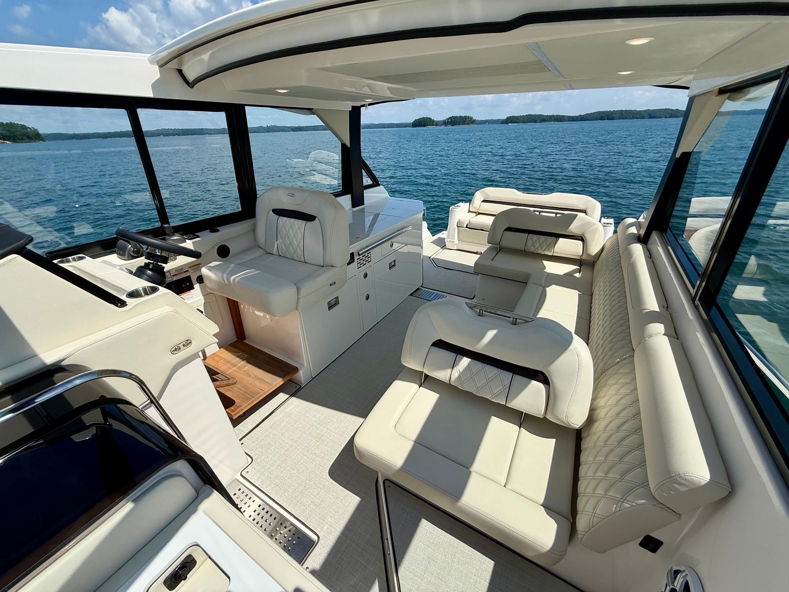 Powered by twin Volvo V8 350 EVC2 DP CAT engines delivering 700 horsepower, the 36 Grande Coupe combines strong performance with smooth handling. Joystick control makes docking simple, whether in tight quarters or busy marinas. This boat is designed to give you confidence on the water, whether you’re running wide open or enjoying a quiet cruise.