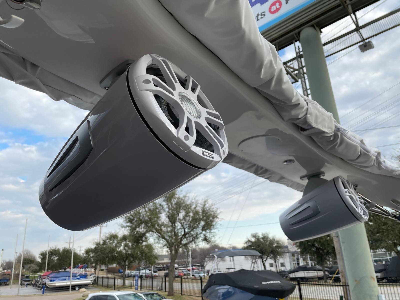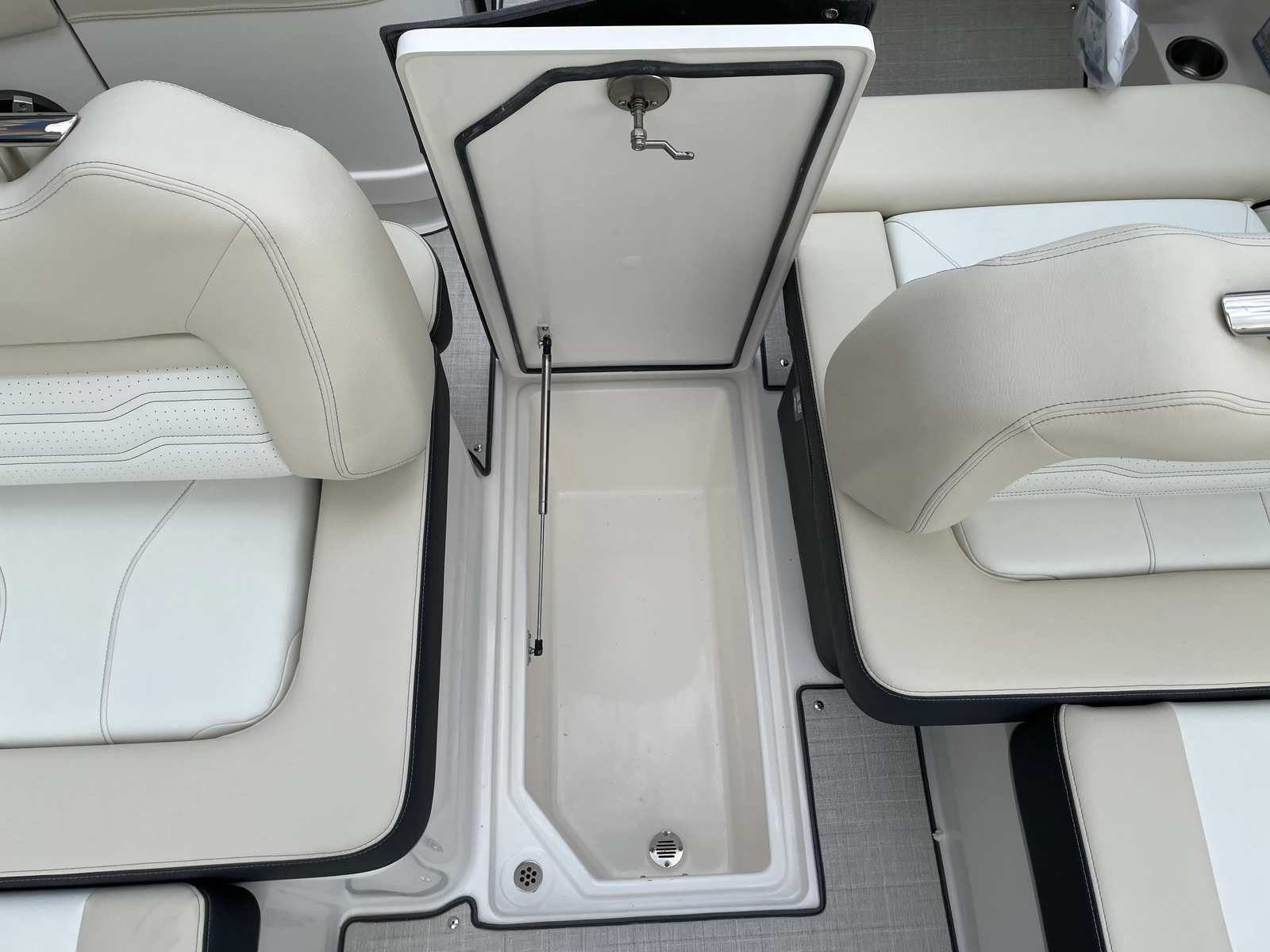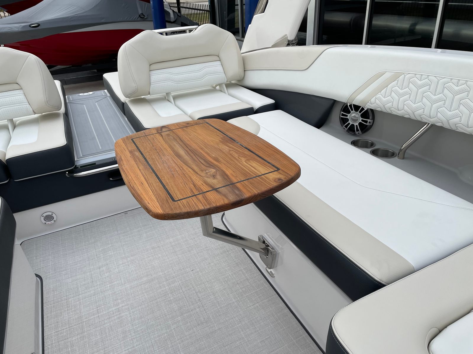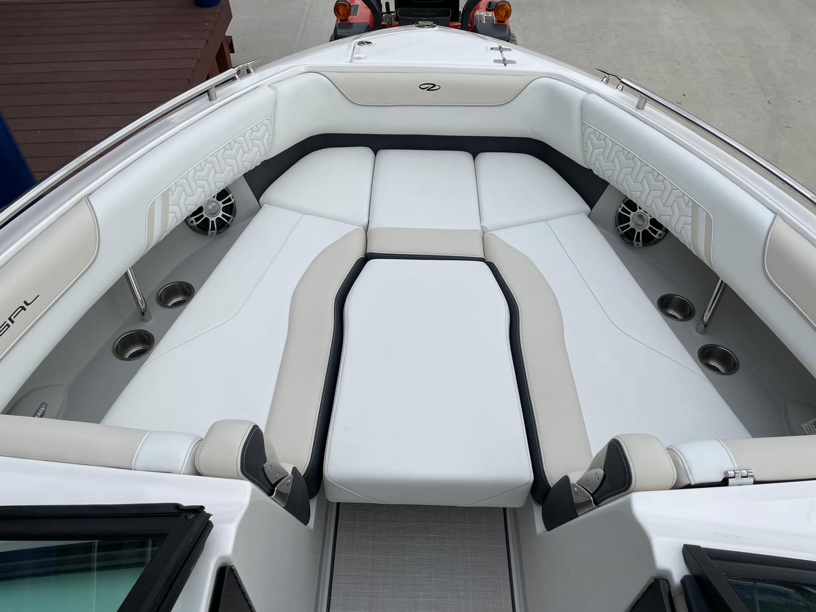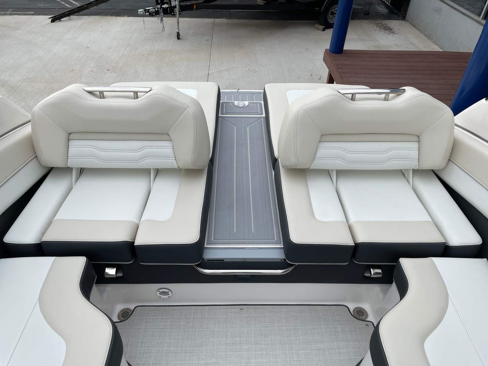The Regal LS6 is designed with both style and functionality in mind, boasting a range of special features that enhance every aspect of your boating experience. The hull is finished in a striking Tahiti Beach White, complemented by a sophisticated Steel Grey bootstripe and a Seafoam bottom color. The swim platform matches the bottom color, creating a seamless and visually appealing look that sets this boat apart from the crowd.Inside, the LS6 features a thoughtfully designed interior with color zones that include Pure White, Graphite, Vista White, and Lunar Grey, creating a modern and inviting atmosphere. The spacious bow seating area is perfect for lounging in the sun or socializing with guests, while the ergonomic helm provides excellent visibility and intuitive controls for the captain. Every detail, from the upholstery to the layout, is crafted to maximize comfort and enjoyment on the water.