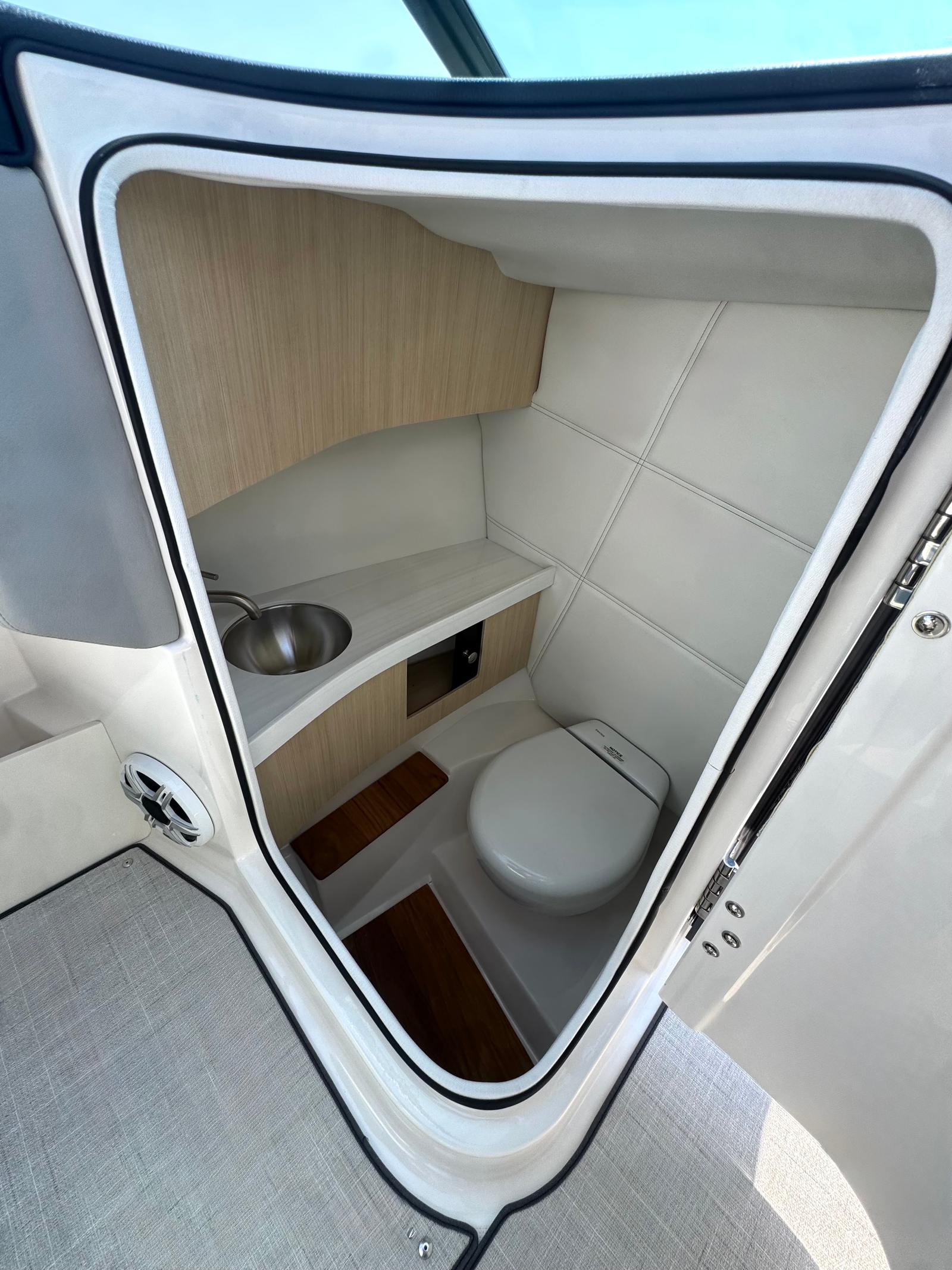 Powered by a Volvo V8 380 EVC2 DP CAT engine, this bowrider produces 380 horsepower with smooth acceleration, responsive handling, and excellent fuel efficiency. Its Mediterranean Blue hull, Tahiti Beach White bottom, and matching bootstripe make a striking impression on the water or at the dock.