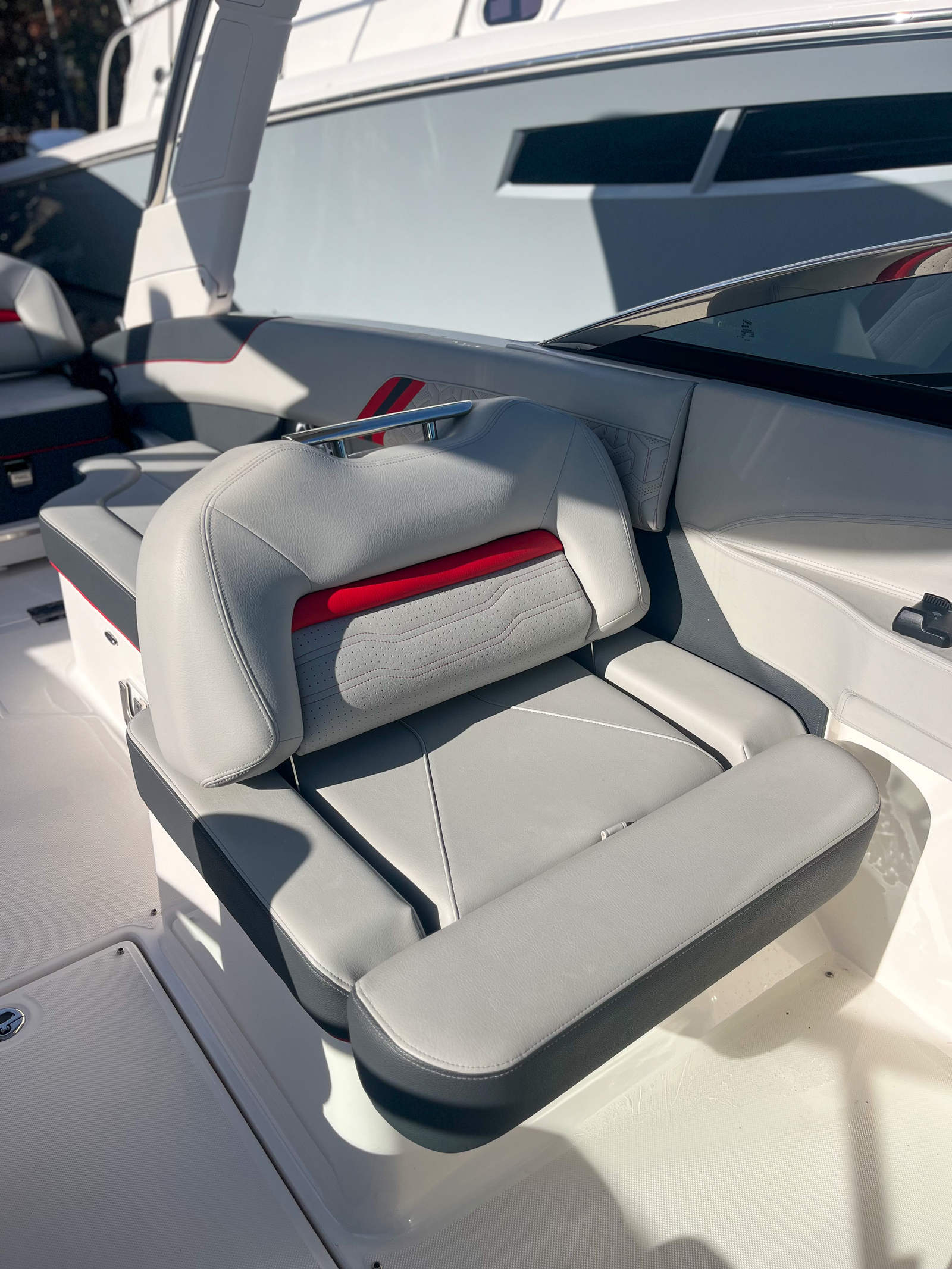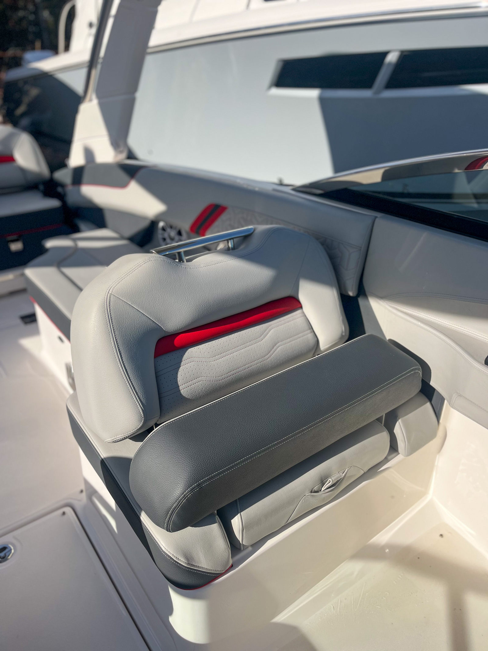 The 2024 Regal LX6 is loaded with premium features that enhance every aspect of your time on the water. The Stereo Performance & Lighting Package transforms the cockpit into an entertainment hub, delivering crisp, immersive sound and vibrant lighting effects for unforgettable onboard parties. Bow & Cockpit Covers provide essential protection from the elements, keeping your boat looking pristine and ready for adventure.For those who love water sports, the Water Sport Tow Pylon is a game-changer, making it easy to tow skiers, wakeboarders, or tubers with confidence. The Dual Battery Switch with Tray and Cables ensures reliable power management, so you can enjoy all your electronics and amenities without worry.The LX6’s interior is a showcase of style and comfort, featuring Flame Red - Simtex and Graphite - Standard upholstery for a bold, contemporary look. The Port Light - Half Moon adds a touch of elegance and natural light to the cabin, while the Cockpit Seagrass Mat provides a soft, non-slip surface underfoot. Underwater Lighting - RGBW creates a mesmerizing ambiance for evening cruises, and the Lunar Grey - Standard accents complete the sophisticated aesthetic.