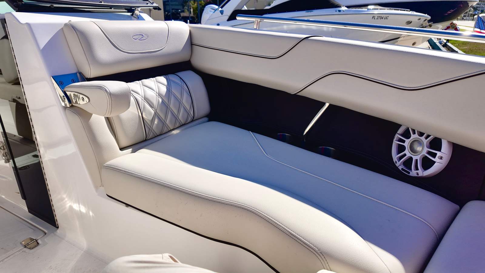 Practicality meets luxury in the Regal LX6 Bowrider. The fender clips simplify docking, allowing you to secure your boat quickly and efficiently. The trim tabs offer precise control over the boat’s performance, ensuring a smooth and comfortable ride regardless of water conditions. Storage solutions are thoughtfully integrated throughout the vessel, providing ample space for gear, water toys, and personal items without compromising on style or comfort.The Yamaha F350XSA2 engine’s fuel efficiency means you can spend more time enjoying the water and less time refueling. The dual Garmin displays and B60 transducer make navigation and fish finding effortless, whether you’re exploring new waterways or returning to your favorite fishing spot. The Regal LX6 Bowrider is designed to make ownership easy, enjoyable, and stress-free.