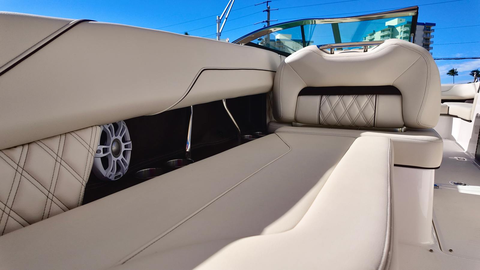At the heart of the Regal LX6 is a single Yamaha F350XSA2 engine, delivering an impressive 350 horsepower. This powerhouse ensures smooth acceleration, responsive handling, and reliable performance whether you’re cruising, towing water toys, or exploring new destinations. The engine’s advanced engineering provides optimal fuel efficiency, making every trip enjoyable and cost-effective. With the addition of trim tabs, you can easily adjust the boat’s attitude for a smoother ride, improved stability, and enhanced control in varying water conditions.