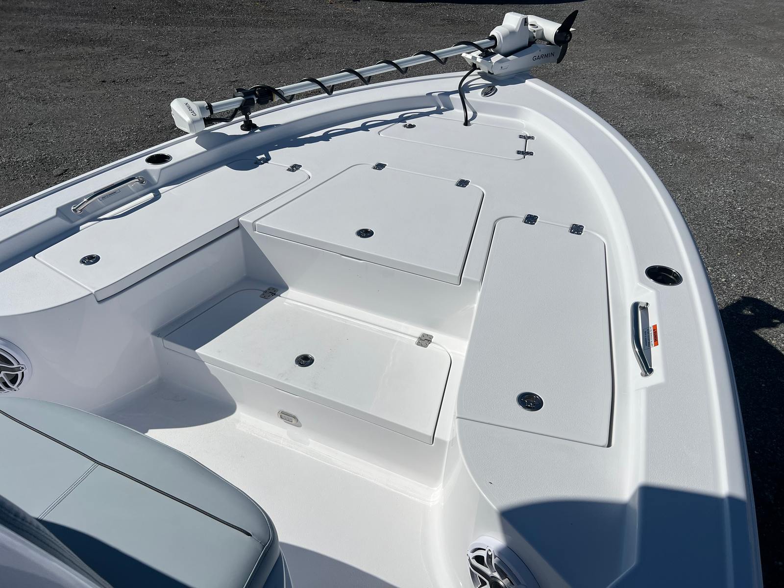 The 2026 Sportsman Masters 227 is packed with premium features that elevate your boating experience. The Edson 13” stainless steel Comfort Grip steering wheel with PowerKnob offers precise control and effortless maneuverability, making navigation a breeze even in challenging conditions. For anglers, the inclusion of two gunwale rod holders provides convenient storage and quick access to your fishing gear.One of the standout features is the Garmin Force Kraken Trolling Motor with a 75-inch shaft in white, offering advanced technology for precise boat positioning and quiet operation. This trolling motor is perfect for stealthy approaches in shallow waters, giving you a competitive edge during fishing trips. The Garmin Fusion/JL Audio Ultra Premium DSP Upgrade transforms your boat into an entertainment hub, delivering crystal-clear sound quality for your favorite tunes while you cruise or relax at anchor.The white powder coating on the hardware not only enhances durability but also adds a sleek, modern touch to the boat’s overall appearance. The thoughtful combination of colors and materials, from the Harbor Haze Blue hull bottom to the Smokey Gray upholstery, creates a cohesive and inviting atmosphere on board.
