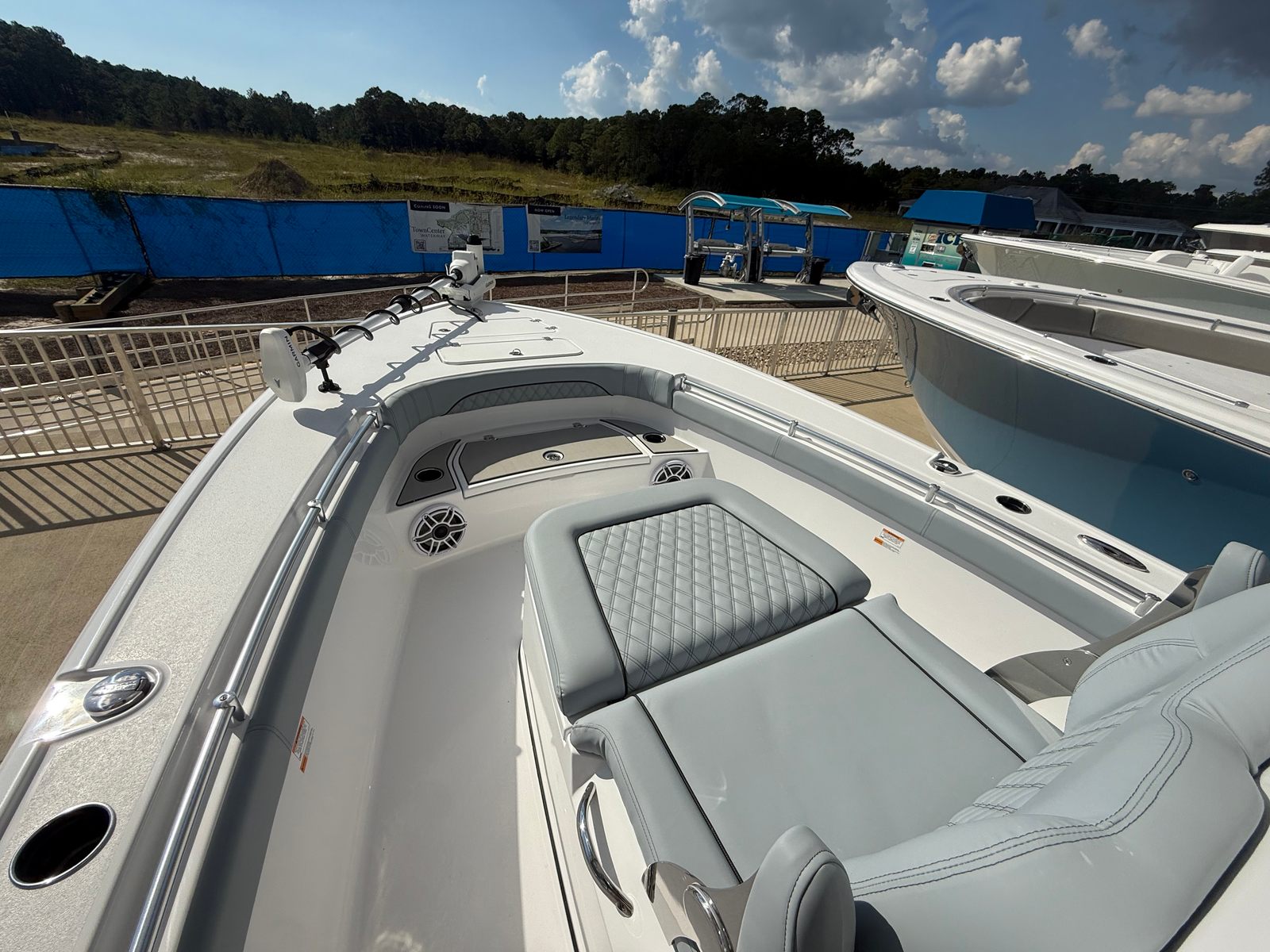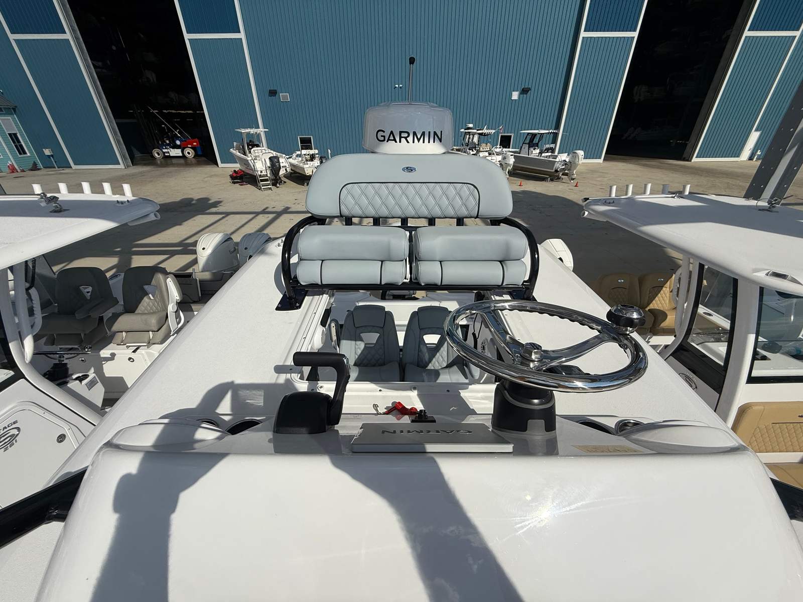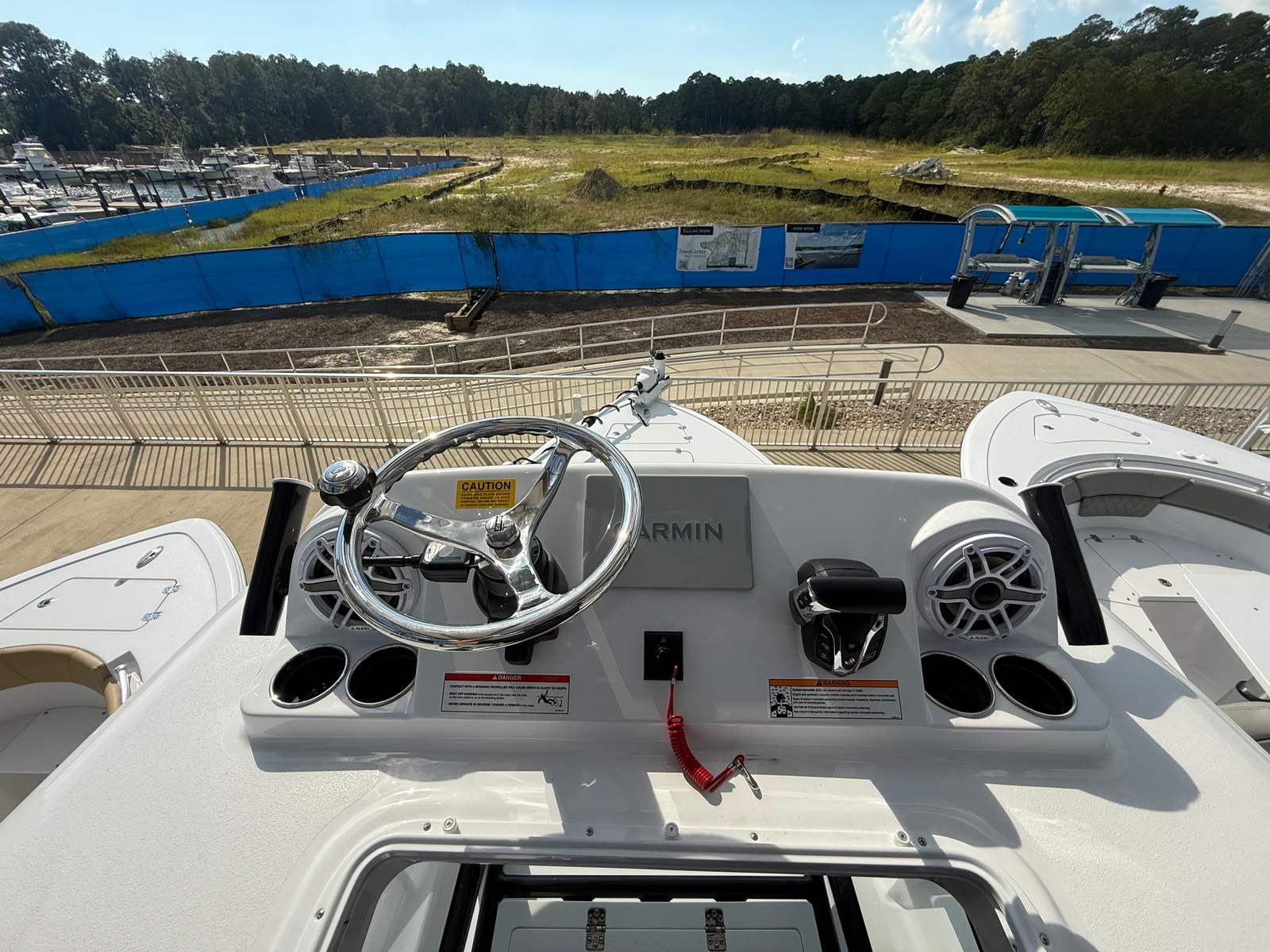 At the heart of the Sportsman Masters 267 OE is a single Yamaha XF450 engine, finished in white to match the boat’s sleek aesthetic. With an impressive 450 horsepower, this Bay Boat is engineered for exhilarating speed and smooth handling. The Yamaha XF450 is renowned for its reliability and efficiency, ensuring that you can navigate coastal waters, bays, and inlets with confidence. Whether you’re chasing the next big catch or simply enjoying a fast cruise, the engine’s power and precision make every outing memorable. The advanced steering system, featuring the Edson 13” stainless steel Comfort Grip Steering Wheel with PowerKnob, provides effortless control and maneuverability, allowing you to handle tight turns and changing conditions with ease.
