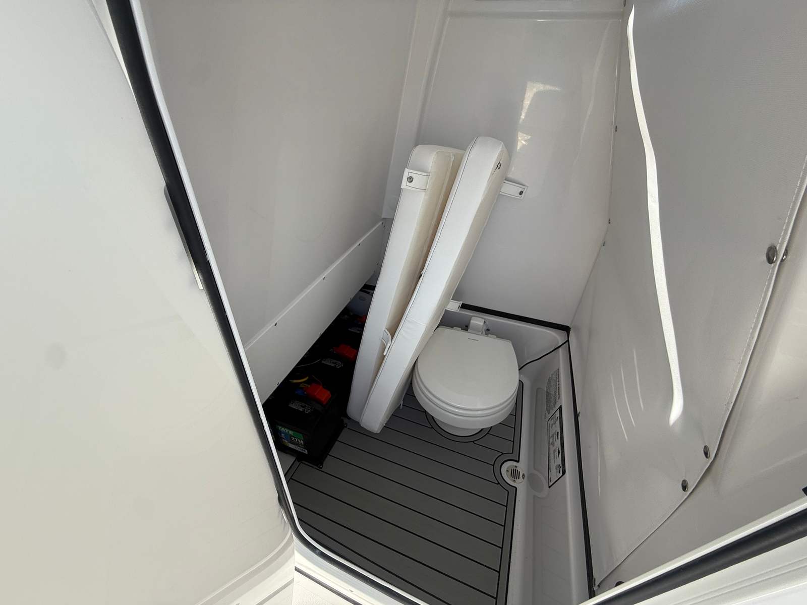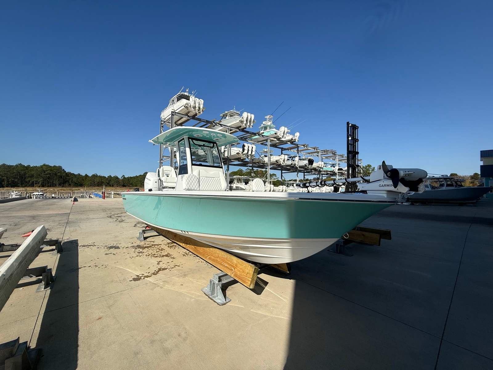 The 2026 Sportsman Masters 267 is packed with premium features that enhance both functionality and comfort. The hull’s Sea Glass Green side and Snow White bottom create a striking visual contrast, while the HardTop’s Sea Glass Green underside adds a touch of sophistication overhead. The Icecap White upholstery offers a clean, modern look and superior comfort for all-day enjoyment. White powder coating throughout the boat not only adds to the aesthetic appeal but also provides durable protection against the elements.For the captain, the Edson 13” stainless steel comfort grip steering wheel with PowerKnob ensures precise control and effortless maneuvering, even in challenging conditions. The Garmin Force Kraken Trolling Motor, with its impressive 75-inch shaft and white finish, offers quiet, efficient propulsion for fishing or slow cruising. The Mastervolt ChargeMaster Plus 50 Amp battery charger keeps your onboard electronics powered up and ready for action, while the porcelain head with overboard discharge and pump out adds a touch of luxury and convenience for longer outings.