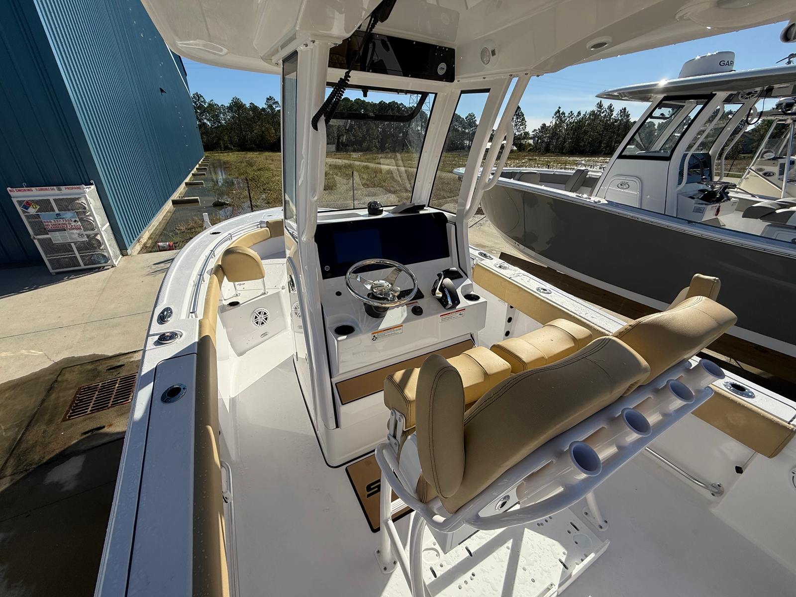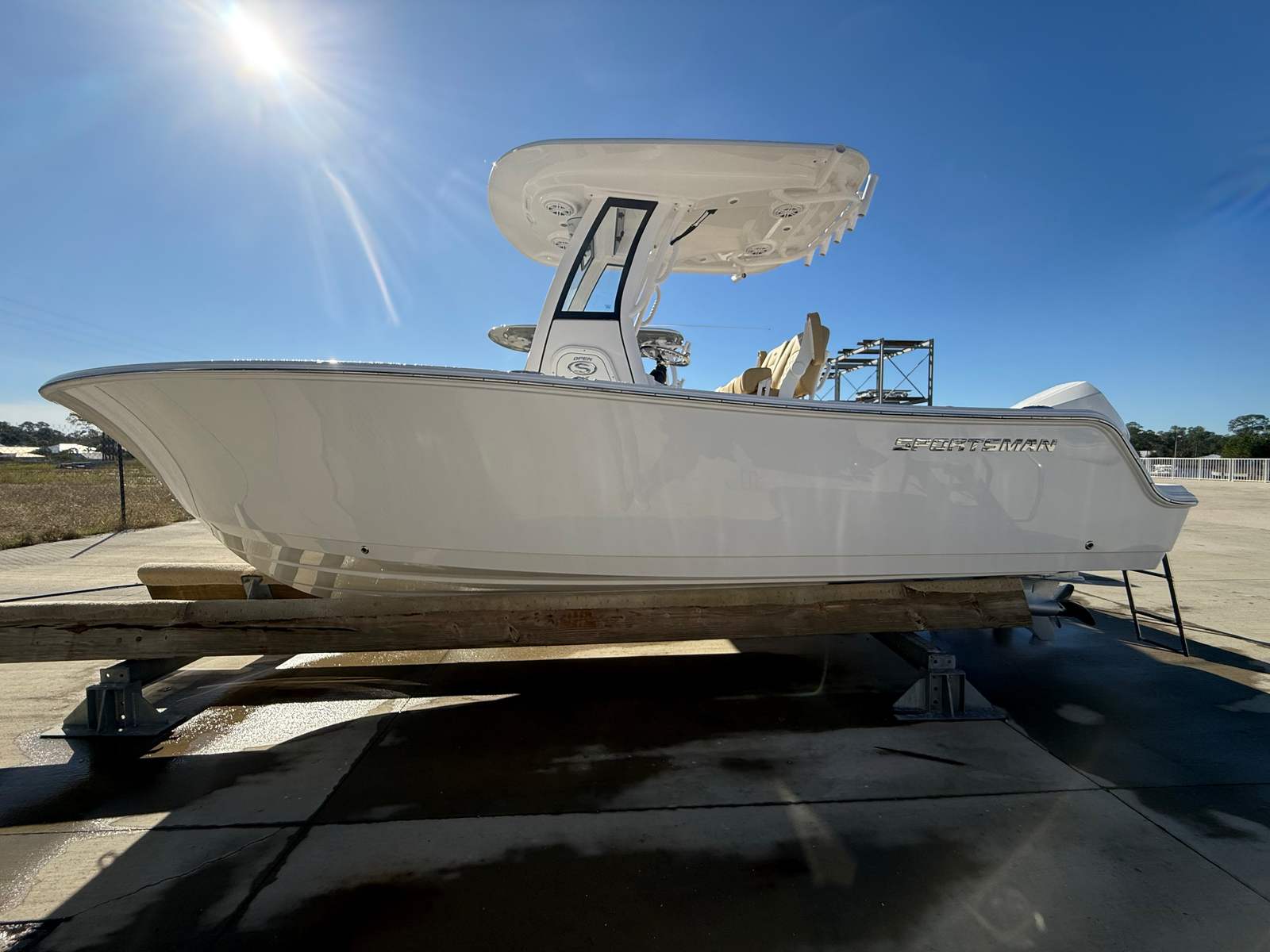 This Sportsman boat for sale is loaded with thoughtful features designed to enhance your time on the water. The removable Bow Sundeck/Table with Cushion offers a versatile space for sunbathing, dining, or simply relaxing with friends and family. The on-board battery charging system (2-bank) ensures your electronics and accessories stay powered up throughout your adventures, providing peace of mind and convenience. For added comfort during longer trips, the included Porta Potti offers a practical solution for onboard needs. The premium dual chair leaning post with flip-up bolsters and armrests delivers ergonomic support and flexibility, allowing you to switch between seated and standing positions with ease.