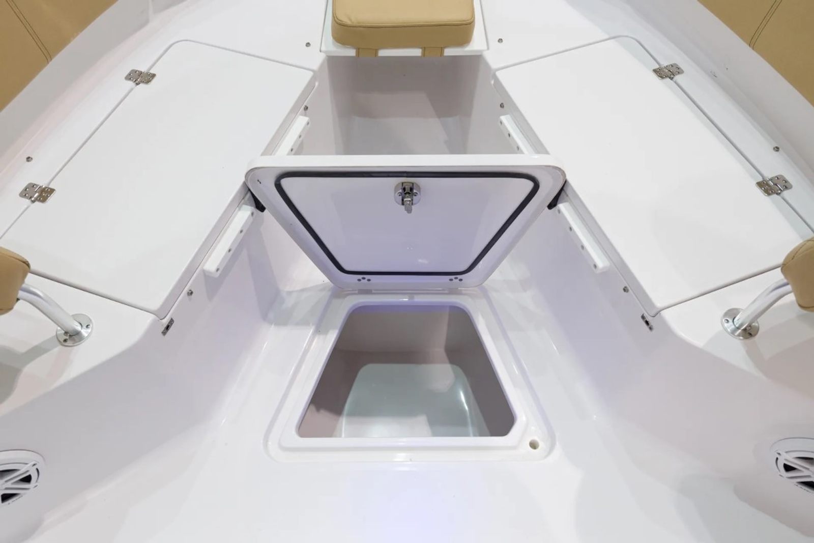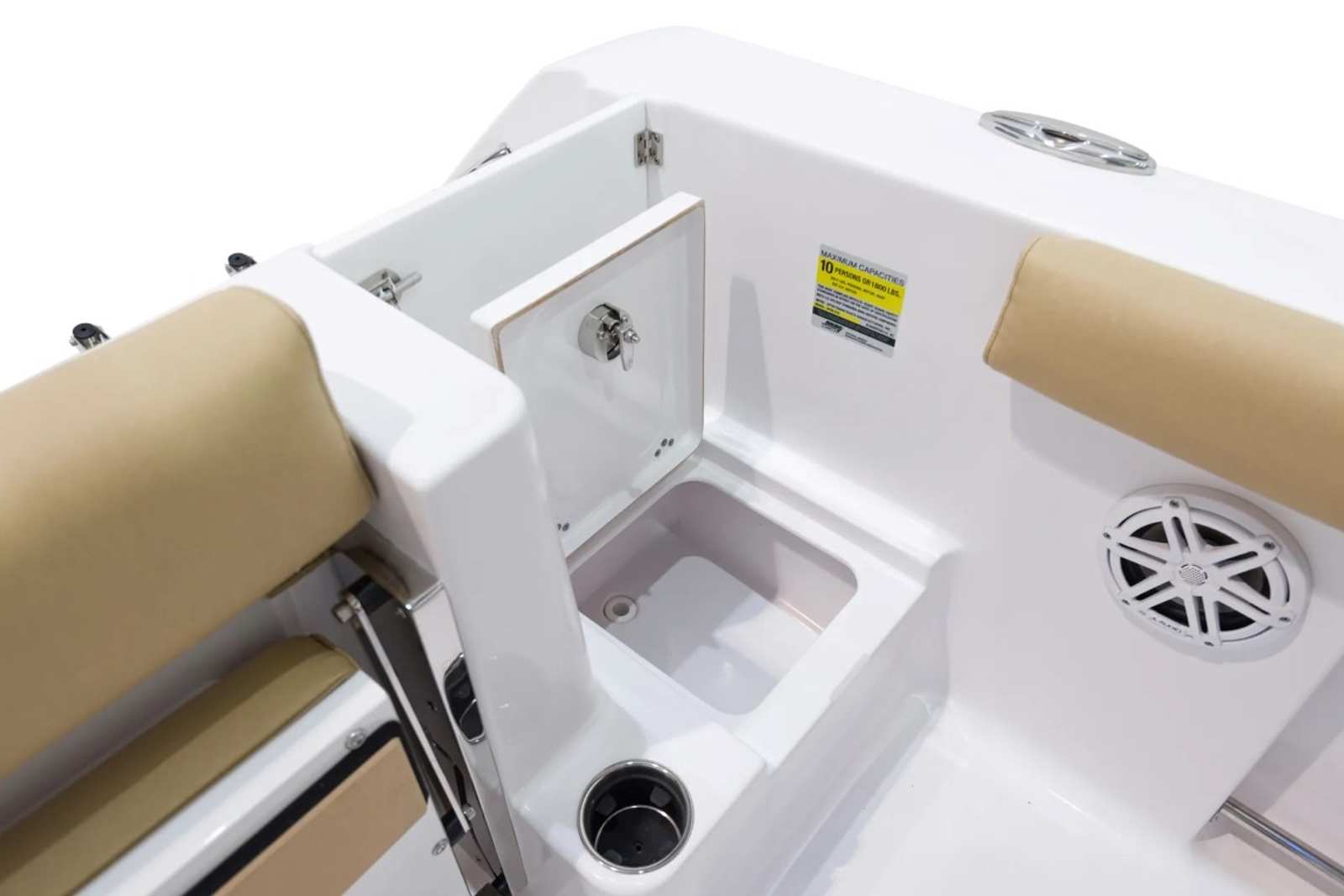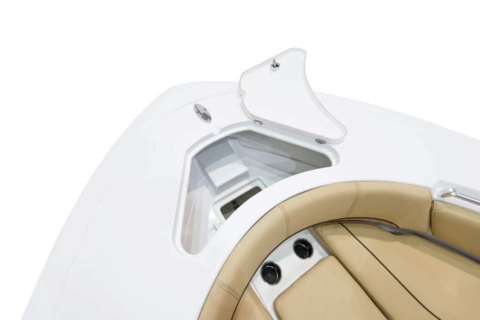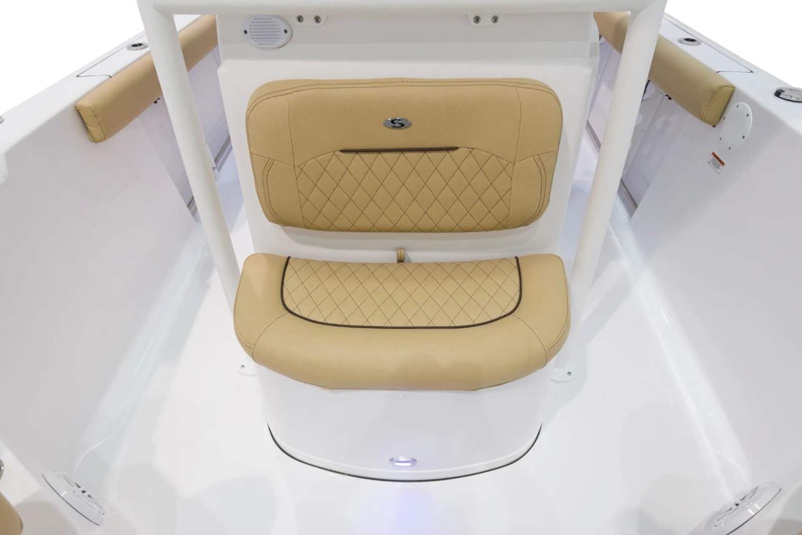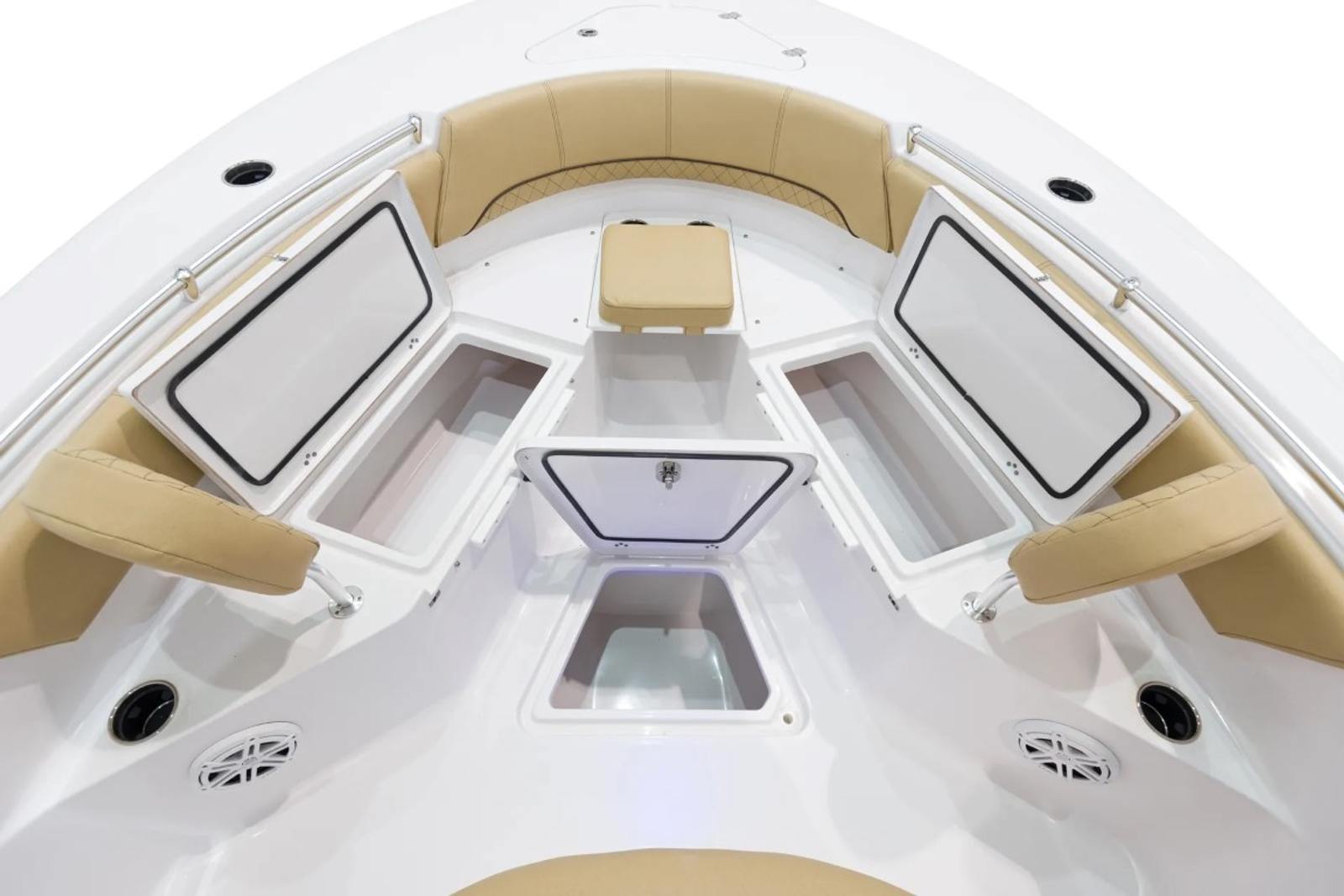 The Sportsman Open 232 is loaded with premium features that enhance both functionality and comfort. The hull and bottom are finished in the striking Explorer Blue, creating a bold and stylish presence on the water. The fiberglass console is thoughtfully designed with a footrest and storage, offering both convenience and ergonomic support during long days at sea. The fiberglass hard top, complete with LED lighting, provides shade and illumination, while the hardtop underside in Explorer Blue adds a custom touch that ties the entire design together.White powder coating adds a clean, modern look to the boat’s framework, complementing the Serenity Sileather Icecap White upholstery. This premium seating material is both durable and comfortable, ensuring that every passenger enjoys a relaxing ride. The dual chair leaning post with flip-up bolsters offers versatile seating options, whether you prefer to sit back or stand while navigating. The Garmin 12" GPS screen with built-in Wi-Fi keeps you connected and informed, making navigation and trip planning effortless.For those who love to relax at the bow, the removable sundeck/table with cushion transforms the front of the boat into a social hub or sunbathing area. This flexible space is perfect for entertaining guests, enjoying a meal, or simply soaking up the sun.