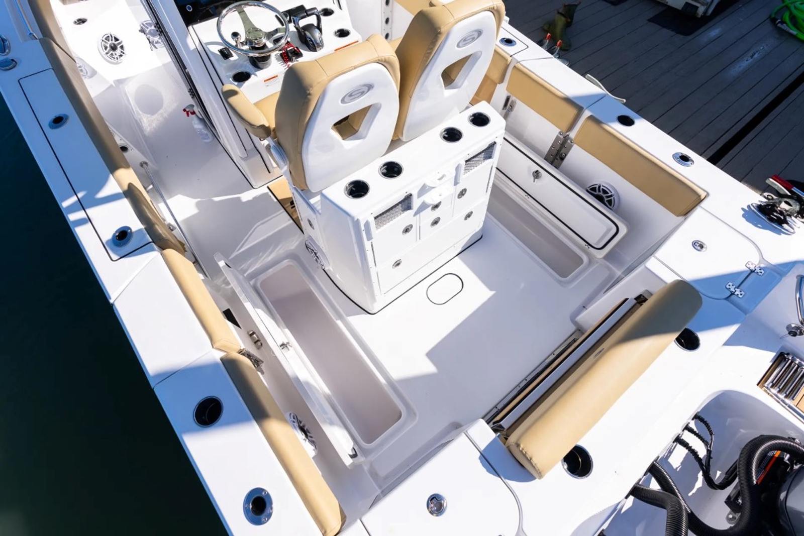 Power and reliability are at the heart of the Sportsman Open 252. Equipped with twin Yamaha F150XSA2 engines, this center console boat boasts a combined 300 horsepower, delivering exhilarating performance and smooth handling. The twin-engine setup provides enhanced maneuverability, making docking and navigating tight spaces a breeze. Whether you are cruising along the coastline, heading offshore for a day of fishing, or enjoying water sports with family and friends, the Open 252 offers the power and agility you need for every adventure.