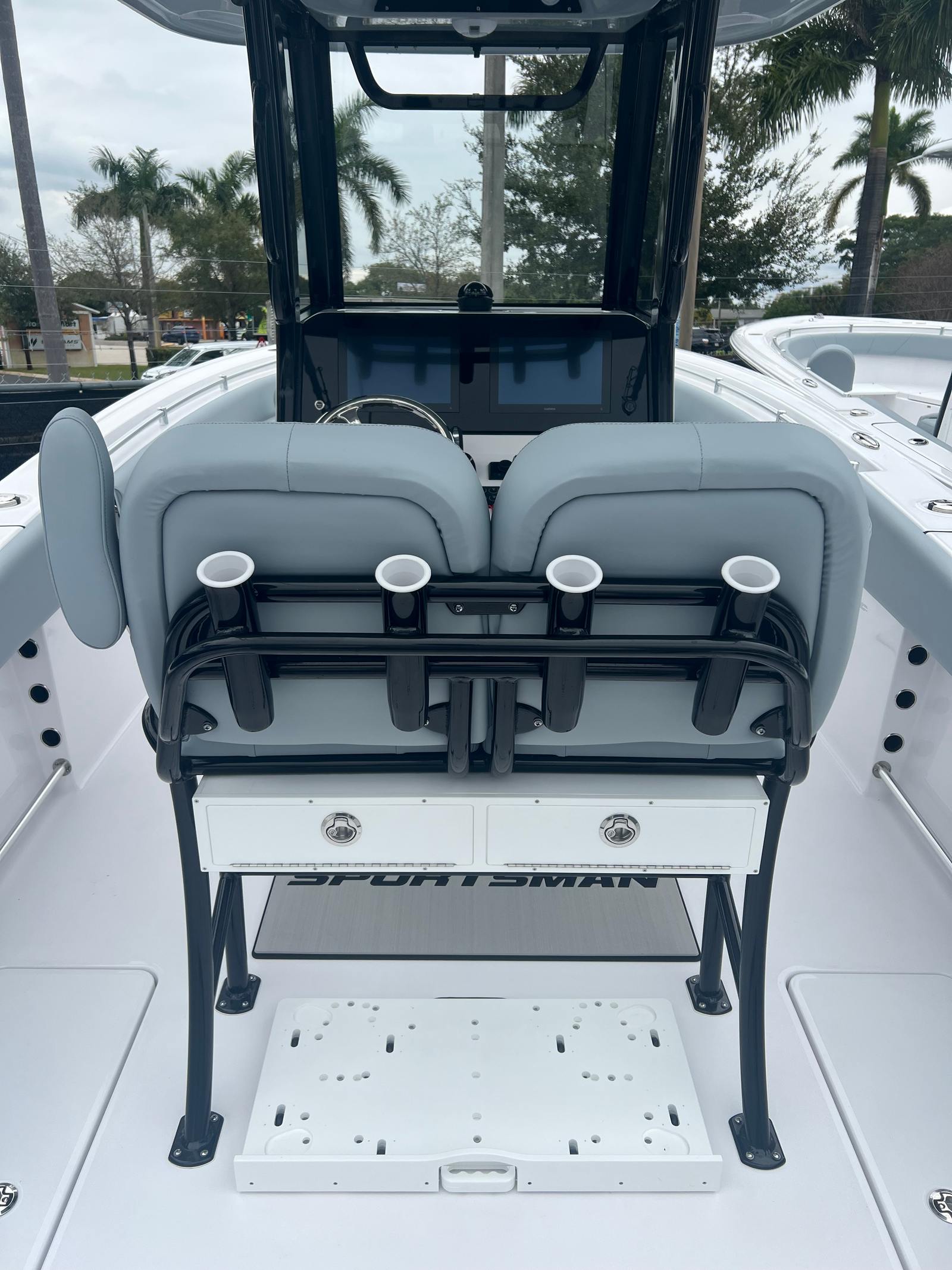 The Sportsman Open 252 is packed with premium features designed to maximize comfort, convenience, and functionality. The fiberglass console with FG liner and cooler seat offers a durable and stylish command center, while the fiberglass hard top with LED lighting ensures protection from the elements and excellent visibility during evening outings. The hardtop underside is finished in Storm Cloud Gray, perfectly matching the hull and adding a touch of elegance.The bow sundeck/table with removable cushion transforms the front of the boat into a versatile space for sunbathing, dining, or socializing. The premium dual chair leaning post with flip-up bolsters provides ergonomic support for the captain and co-captain, allowing for comfortable long-distance cruising or quick transitions during active fishing sessions. Navigation is a breeze with two Garmin 12" GPS screens featuring built-in Wi-Fi, offering state-of-the-art chart plotting, fish finding, and connectivity for all your marine electronics.