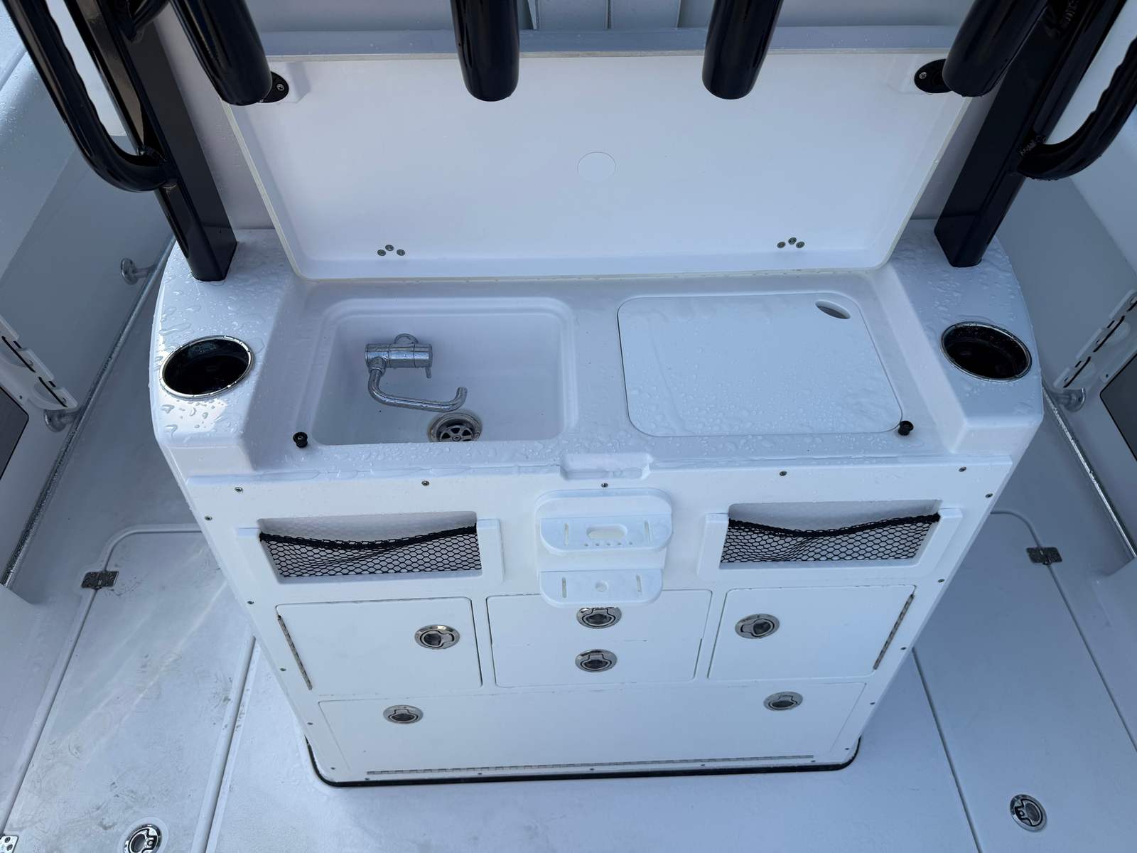 The Sportsman Open 282 is loaded with premium features designed to enhance every aspect of your boating experience. The half tower with a second station provides elevated visibility and control, perfect for spotting fish or enjoying panoramic views. Electric reel outlets cater to serious anglers, making deep-sea fishing more convenient and enjoyable. Stay ahead of the weather with the Garmin GXM™ 54 SiriusXM® Weather Antenna, offering real-time updates to keep your adventures safe and well-informed. The black powder coating adds a modern touch to the boat’s hardware, while the Icecap White upholstery ensures comfort and style throughout the deck. Every feature has been thoughtfully integrated to maximize convenience, safety, and enjoyment on the water.