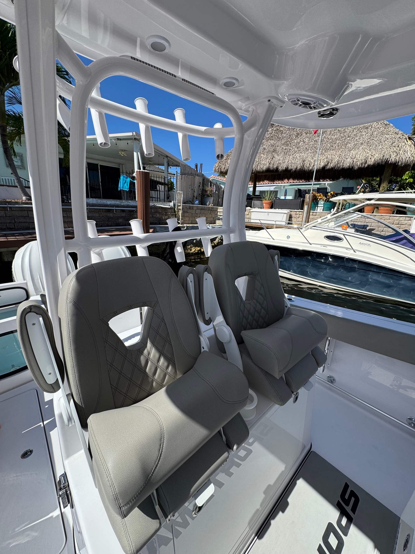 The Sportsman Open 302 is loaded with premium features designed to enhance your boating experience. The Sundeck/Table Cushion offers a versatile space for sunbathing or gathering around for a meal, while the Sileather Ash Gray Upholstery provides a sophisticated and durable seating option that stands up to the elements. Navigation and connectivity are elevated with two Garmin 16" GPS screens featuring built-in Wi-Fi, ensuring you stay on course and connected wherever your journey takes you. The Mastervolt ChargeMaster Plus 50A Battery Charger keeps your onboard systems powered and ready, while the Hardtop Underside Color in white adds a touch of elegance and style.For those seeking shade and comfort, the Gemlux Coastal Base System with shade (front) offers protection from the sun, making long days on the water more enjoyable. The Edson 13 SS Comfort Grip Steering Wheel with PowerKnob provides precise handling and control, while the fiberglass console with FG liner and cooler seat adds both functionality and convenience. Communication is seamless with the second Garmin 215 VHF radio and antenna, ensuring you are always in touch, whether coordinating with other boats or staying updated on weather conditions.