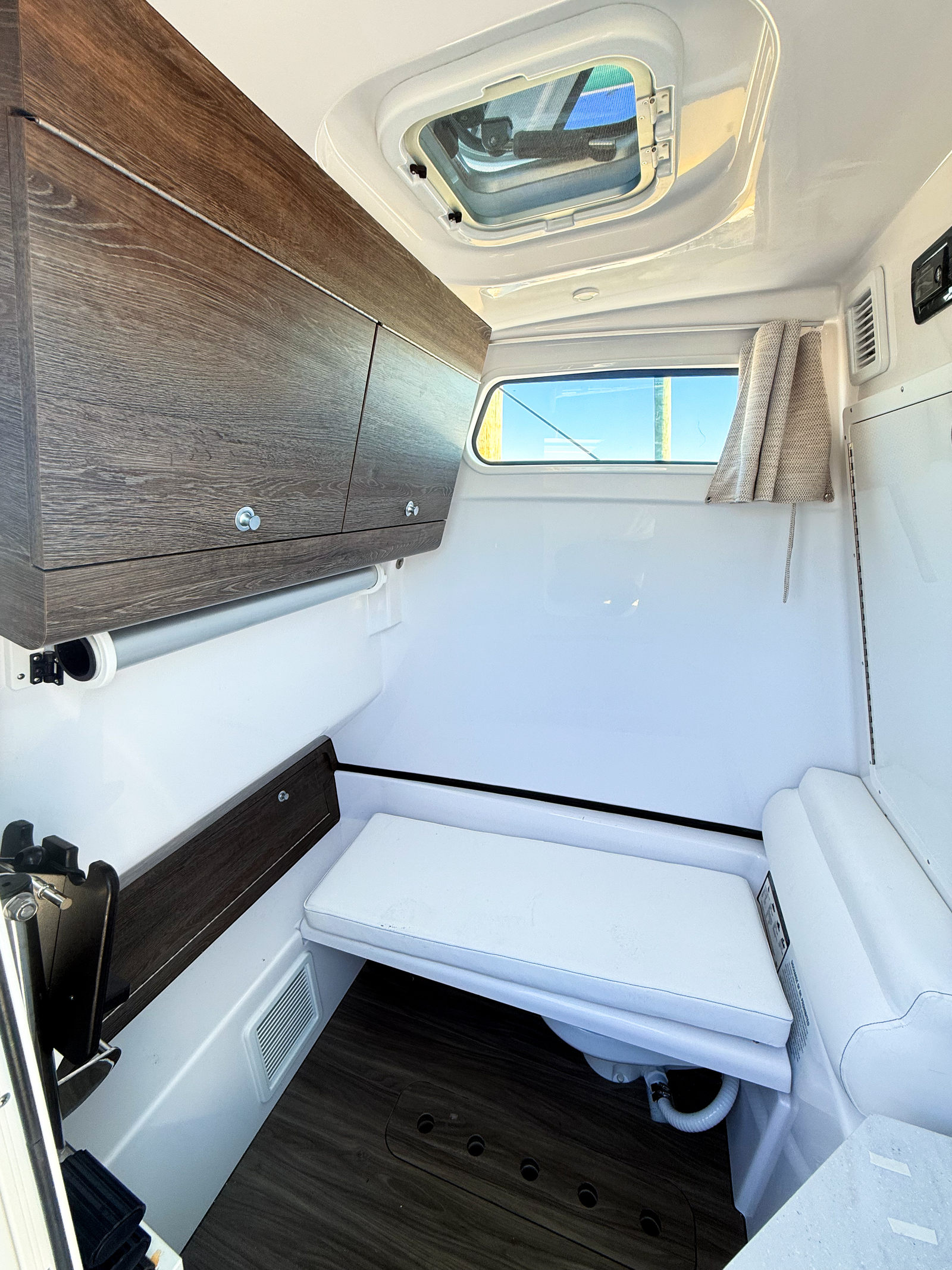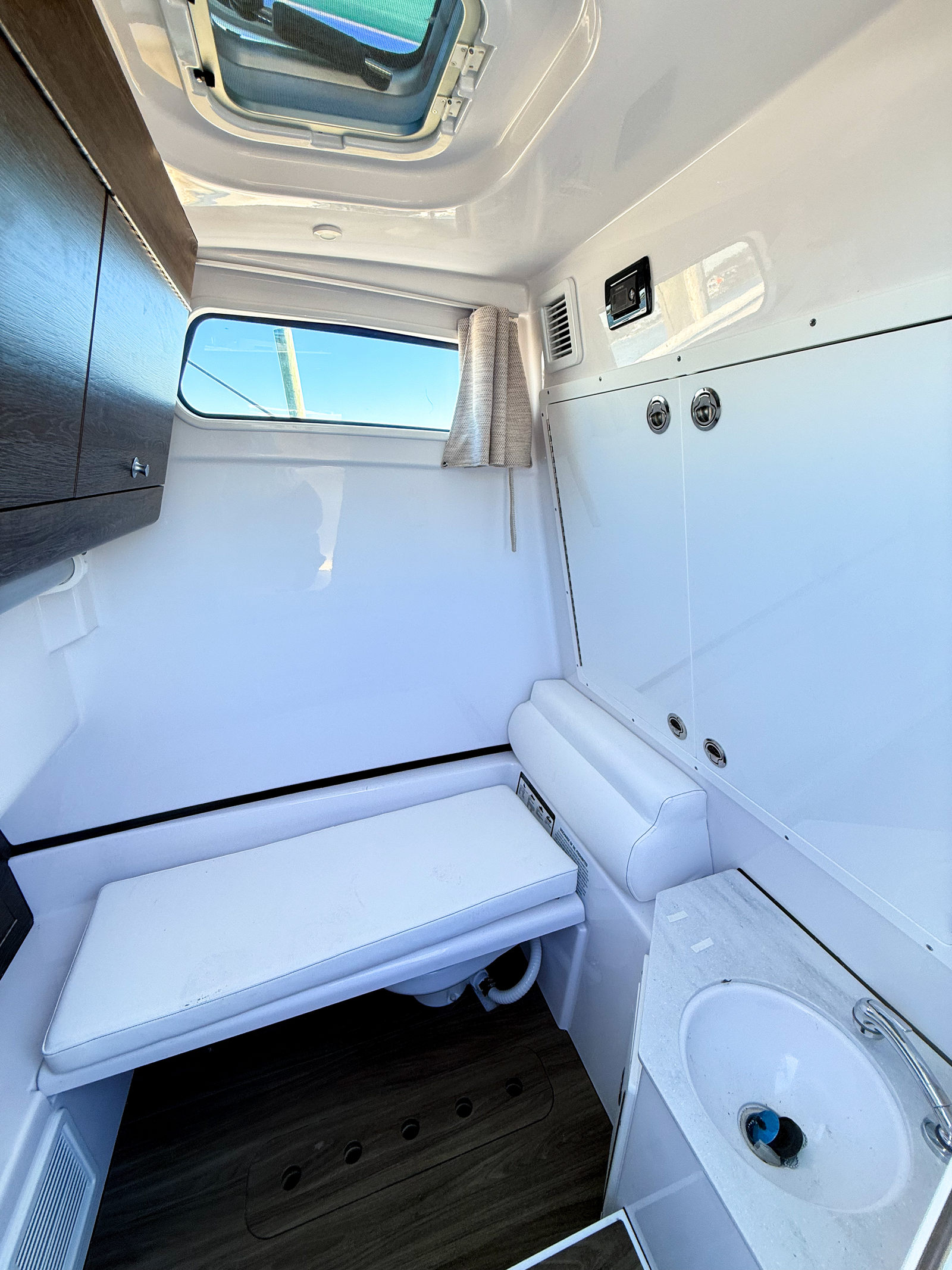 The 2025 Sportsman Open 322 is loaded with premium features designed to enhance your boating experience. The dual Garmin GPSMAP 1643xsv 16" screens offer state-of-the-art navigation and fish-finding capabilities, ensuring you stay on course and maximize your time on the water. The HardTop, with its Sea Glass Green underside, not only adds to the boat’s striking appearance but also provides essential shade and protection from the elements. The Seakeeper 2 Gyroscopic Stabilizer is a game-changer, virtually eliminating boat roll and ensuring a stable, comfortable ride even in choppy conditions. For those hot summer days, the 12V 3500 BTU air conditioning system keeps the interior cool and inviting, allowing you and your guests to relax in total comfort.