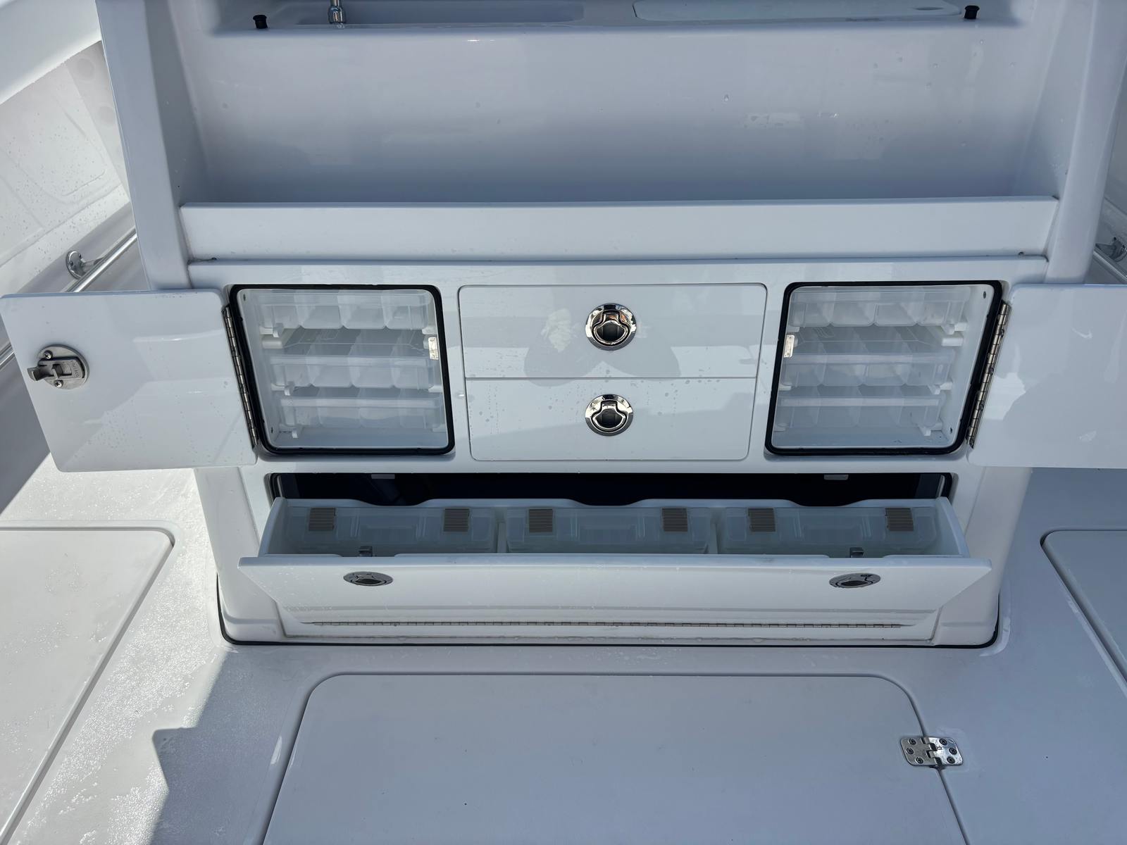 The 2025 Sportsman Open 322 is loaded with premium features designed to enhance your boating experience. The sundeck/table cushion offers a versatile space for sunbathing, lounging, or enjoying meals with friends and family. The fiberglass console, complete with a fiberglass liner and cooler seat, provides both durability and convenience, ensuring your refreshments stay cool throughout the day. The Edson 13-inch stainless steel comfort grip steering wheel with PowerKnob delivers smooth and comfortable handling, even during long days on the water.A standout feature of this center console boat is the fiberglass hardtop with integrated LED lighting, offering shade and illumination for both daytime and nighttime adventures. The hardtop’s underside, finished in a stylish Ice Blue, adds a custom touch that complements the boat’s overall aesthetic. For navigation and safety, the Garmin GMR 434 xHD3 open array radar system ensures you have the latest technology at your fingertips, providing clear and accurate information for confident cruising.