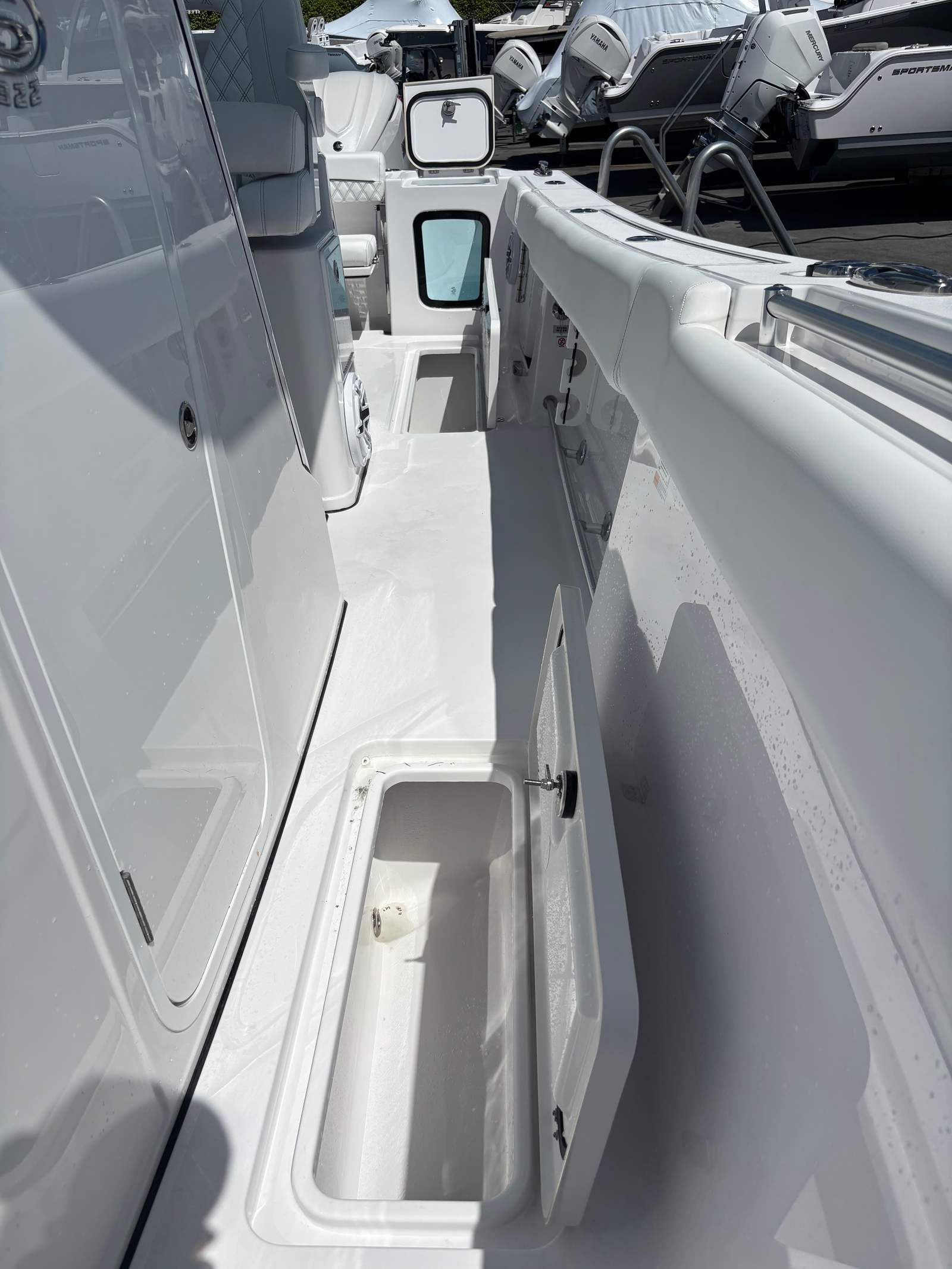 At the heart of the Sportsman Open 322 are twin Yamaha F350XSA2 engines, delivering a combined 700 horsepower. This powerful setup ensures exhilarating acceleration, impressive top speeds, and the confidence to tackle a variety of water conditions. Whether you are cruising along the coastline or heading offshore for a day of fishing, the Open 322’s performance is both thrilling and dependable. The Yamaha Helm Master EX system, complete with autopilot, provides precise control and effortless maneuvering, making docking and navigation a breeze. With this level of power and technology, you can expect a responsive and enjoyable ride every time you hit the water.