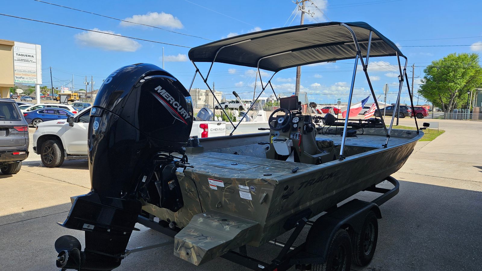 This Tracker boat for sale is designed with practicality in mind. The tandem axle trailer simplifies launching and retrieving the boat, while also providing secure storage when not in use. The Bimini top offers essential protection from the elements, making it easier to stay out longer and enjoy more of what you love.The Garmin electronics and trolling motor add a new level of convenience, allowing you to focus on fishing and fun rather than navigation and setup. The efficient 4-stroke Mercury engine not only delivers impressive power but also helps you make the most of every gallon of fuel, so you can spend more time on the water and less time at the pump.